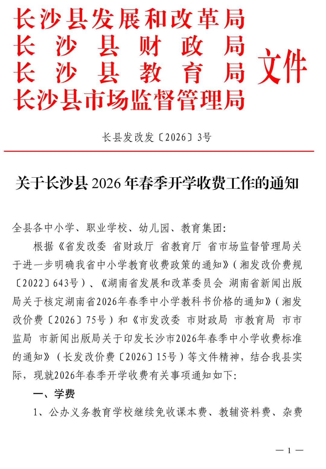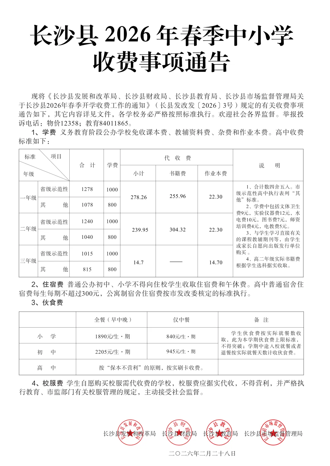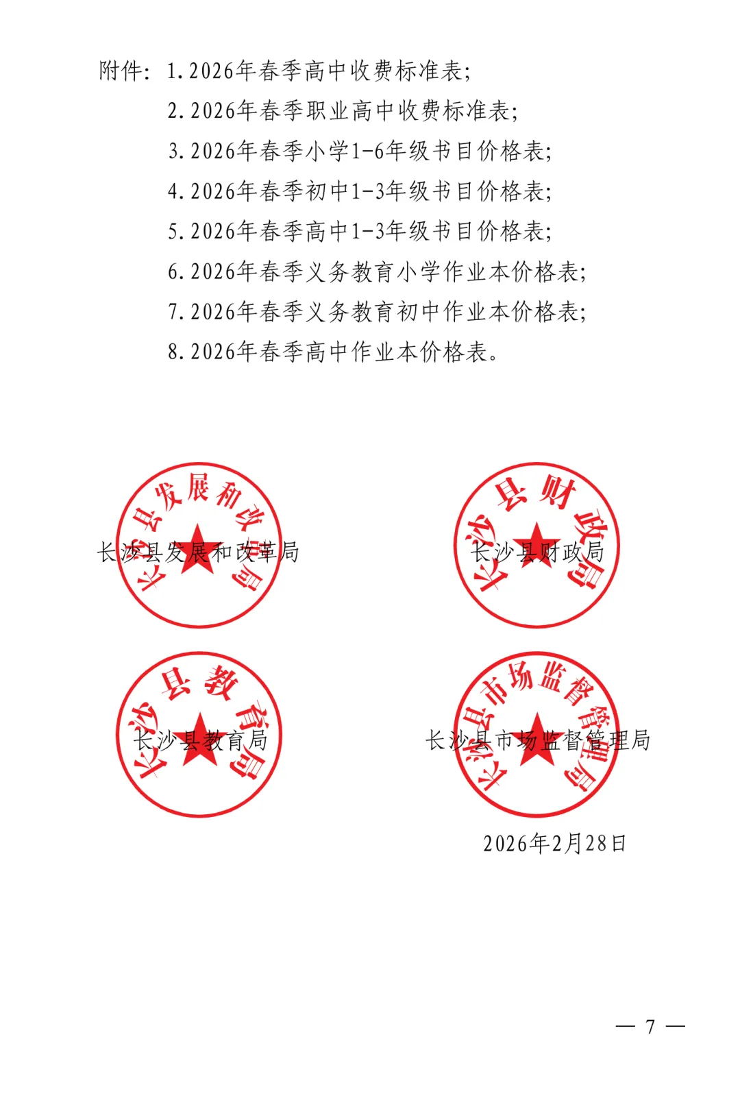>长沙县2026春季开学收费文件公示
