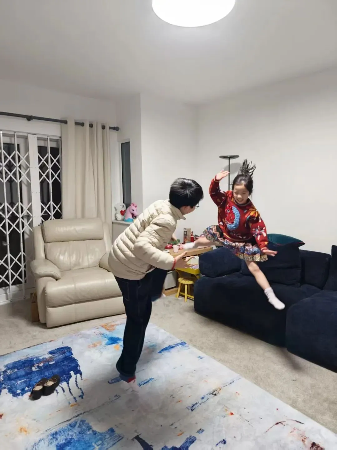 从伦敦驱车前往伯明翰,两个多小时车程。一路兴奋不已的孩子,终于在车上沉沉睡去。到家时,娜娜早已从楼上迎了下来,一见到我便高声唤着,说一直在等我们。谷儿见到妹妹更是激动万分,两人一见面便在客厅里切磋起 “武艺”。娜娜又是倒立,又是腾空翻腾,一套体操动作信手拈来。兄妹俩连滚带爬、嬉笑追逐,满屋子都是快活的声响,热闹又温暖。娜娜主动把自己的小床让给哥哥,谷儿躺在满是温柔气息的床上,第一晚便安睡整夜。孩子们仿佛天生无惧时差,精力充沛,实在叫人惊喜。