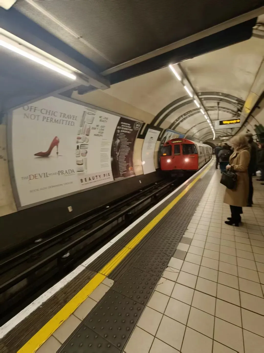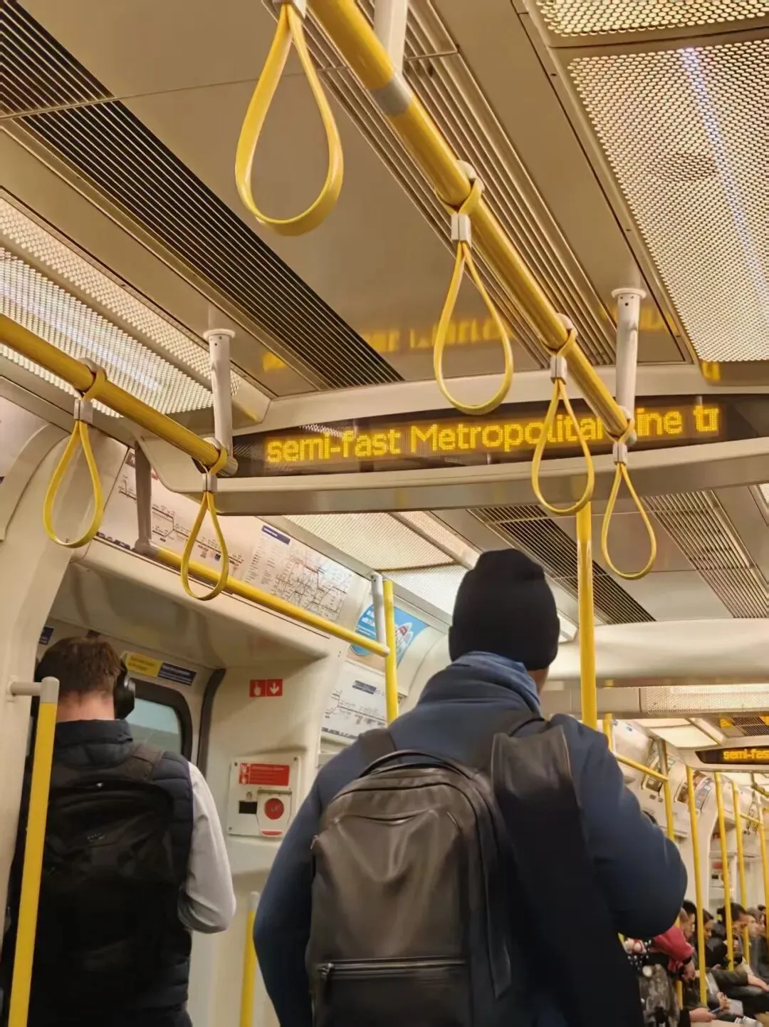 随后,我们辗转几站,专程前往搭乘大都会线(Metropolitan Line)。可抵达站台一看,竟意外发现这条线路的车厢,比之前乘坐的中央线(Central Line)还要新。谷儿满心好奇地问起缘由,我猜想,大抵是先前的车厢已然老旧,故而才做了更换吧。
