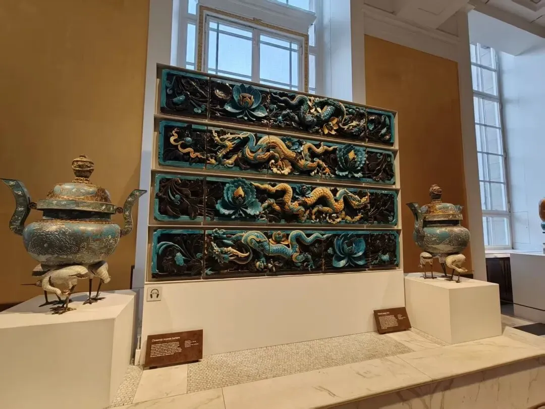 展厅中有个特别耀眼的存在——来自明代山西的龙纹琉璃瓦。它们静静地悬在墙上,黄与蓝交错排列,仿佛把六百年前的雨声、风声和香火声,都凝固在了这一片片坚硬的温柔里。龙在咱们传统上,认为它是掌控云雨,呼风唤雨的神,因而有防范火灾的美好寓意。再加上中国古代建筑的主要材料是木头,所以避火的寓意尤为重要。据说,它们原本共有二十二片,为了呈现最和谐的排列之美,修复时毅然舍去了两片——这大概就是文物界的“断舍离”吧。