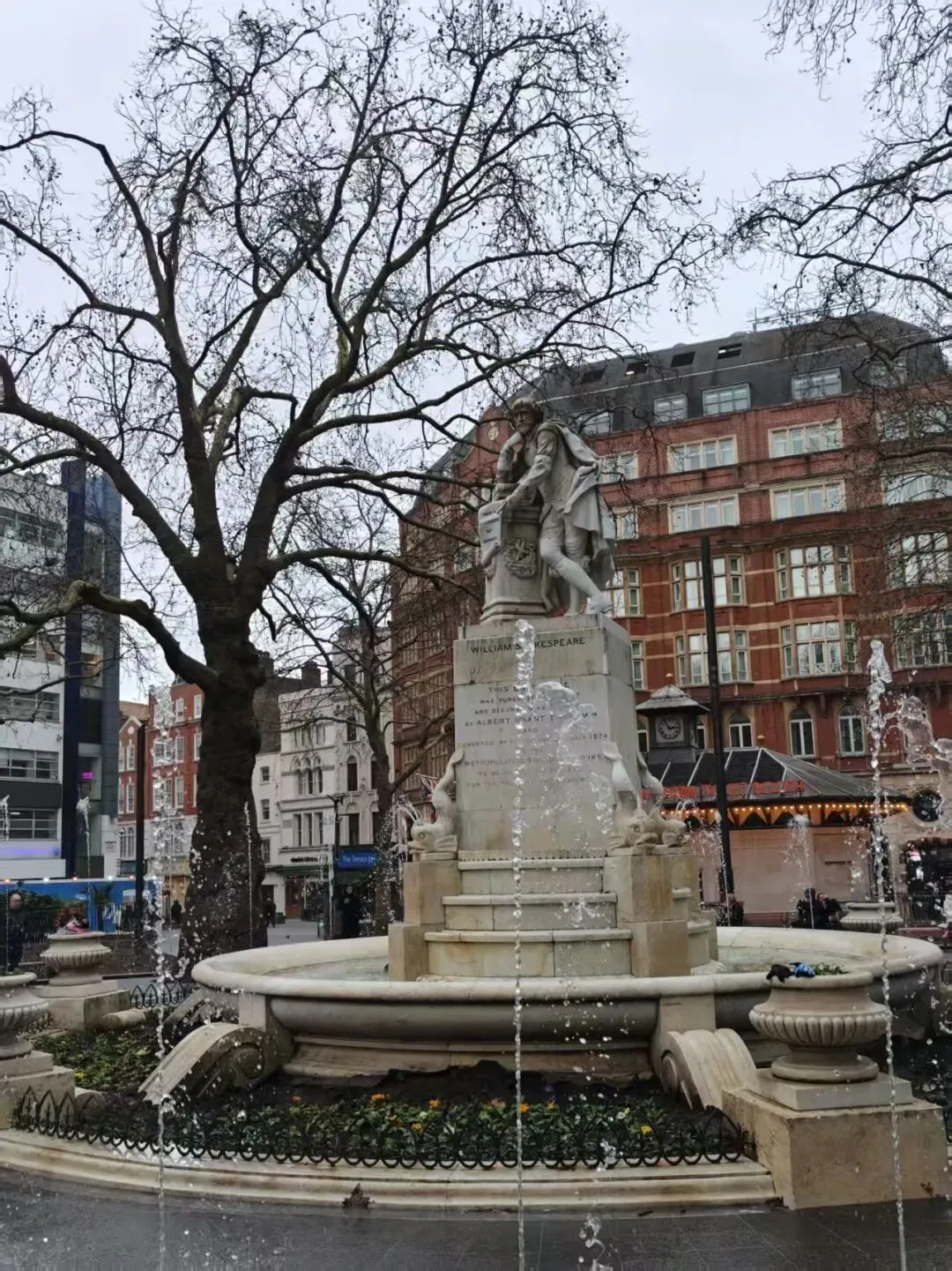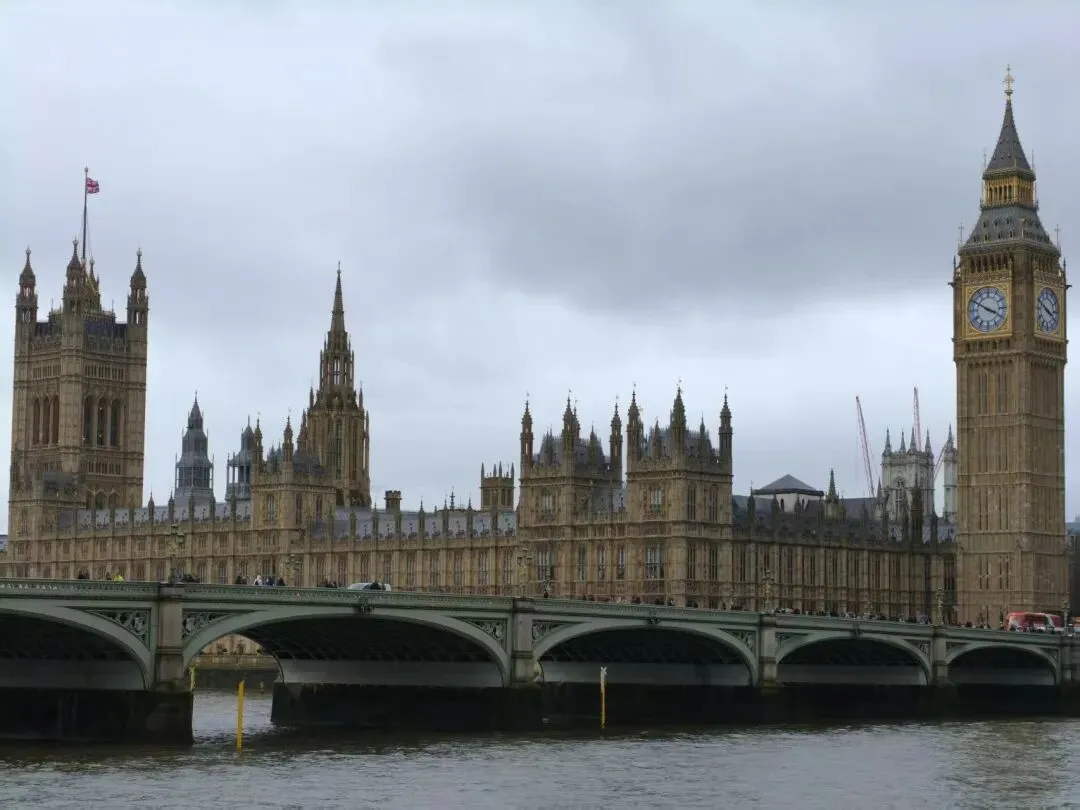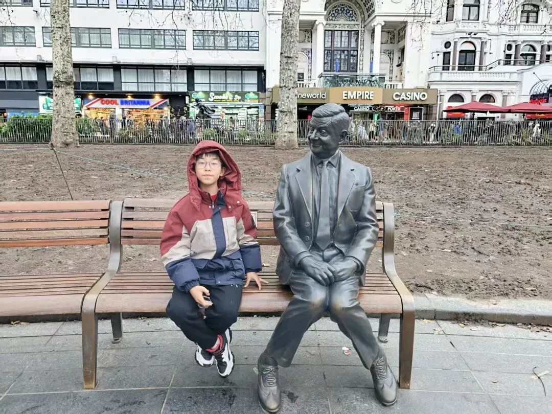 从唐人街转角出来就是皮卡迪利环形广场Piccadilly Circus,被称为“伦敦的肚脐眼”,是伦敦市中心最繁忙的交通枢纽和娱乐购物枢纽,以爱神雕塑喷泉转盘辐射的五条大街,布满了奢侈商场和潮流店。儿子在喷泉附近的长椅上与憨豆先生合了个影。接着,我们就转地铁去看大本钟了。威斯敏斯特地铁站出口就正对大笨钟,我们在伦敦桥上驻足了一会儿,阴天的伦敦仍然别有一番风味。泰晤士河上浮着一层薄雾。大本钟就立在那里,像一位沉默的守望者,它的尖顶刺破灰蒙蒙的天际,却刺不破这厚重的寂静。远处的伦敦眼在雨雾中若隐若现,像一只朦胧的巨眼,注视着这座古老的城市。而大本钟依然矗立,它的指针在雨幕中缓缓移动,丈量着这座城市的悲欢。
