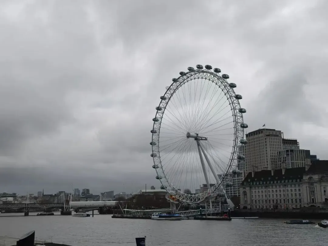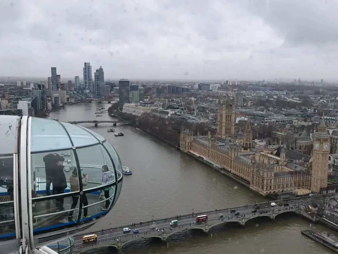 我们通过伦敦桥走到了伦敦眼,看到没什么人排队,果断买了票。 随着轿厢缓缓升起,整个城市逐渐铺展在眼前,宛如一幅生动的画卷。泰晤士河流淌着,随着轿厢升高,可以看到很多伦敦的地标建筑如碎片大厦、白金汉宫、大本钟、威斯敏斯特教堂等。当升至最高点,仿佛触手可及那片灰蒙蒙的天空,心中不禁涌起一股莫名的激动。在这里,时间仿佛静止,只留下这份难得的宁静与美好。
