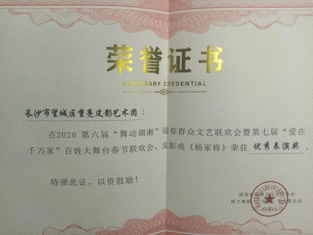 近日,由湖南省文化和旅游厅指导,湖南省湖湘文化交流协会主办的2026湖南省湖湘文化交流协会第六届“舞动湖湘”群艺联欢会暨第七届“爱在千万家”百姓大舞台春节联欢会精彩举办。长沙皮影戏省级代表性传承人朱国强及其团队受邀在活动中表演并获得“优秀表演奖”。