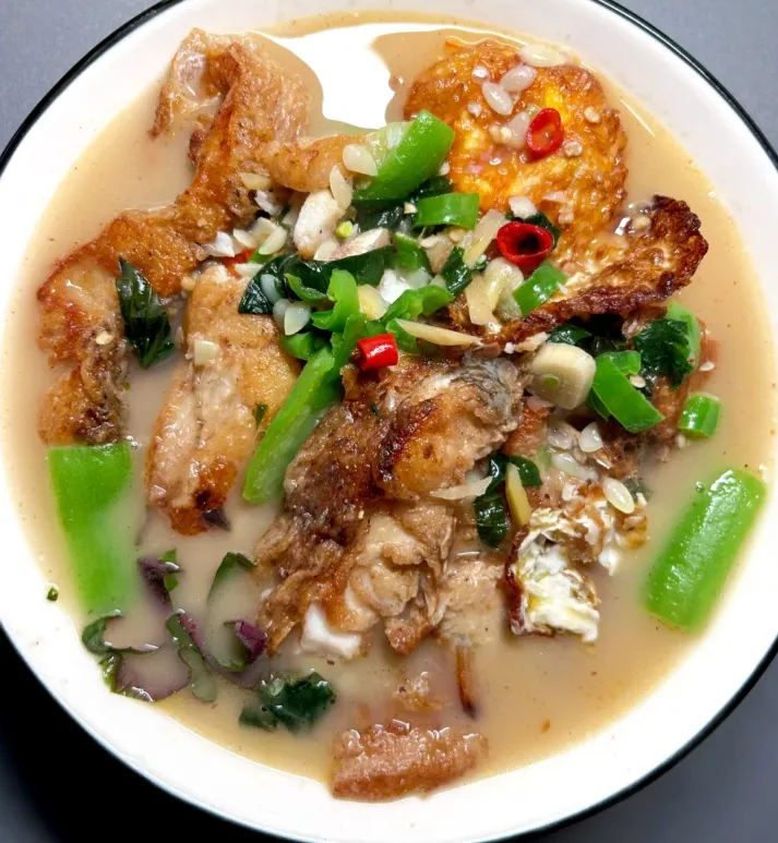 汤一喝,人就醒了。做法讲究一个“鲜”字。活鱼现杀,切块后先用猪油在锅里两面煎黄,这一步最关键,锁住鱼肉的香。紧接着冲入滚烫的开水,大火猛催,汤色瞬间变成奶白色。不放过多的调料,米粉吸饱了鱼汤的鲜甜,配上一点切碎的黄贡椒,辣味微微渗出来,一口下去,额头冒汗,通体舒畅。