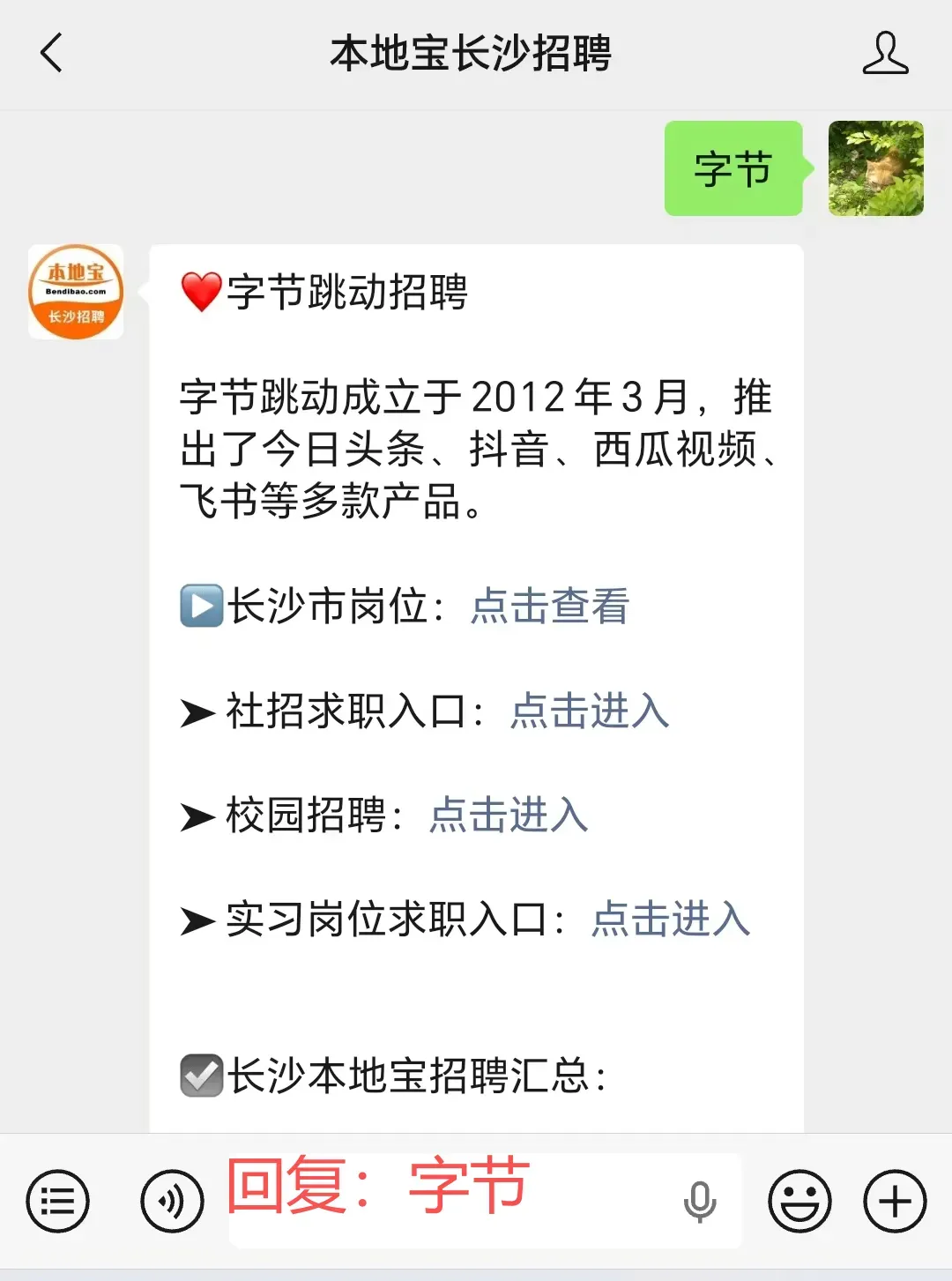 扫描下方二维码,进入【本地宝长沙招聘】,在对话框回复关键词【字节】,即可快速进入字节招聘官网获取招聘详情、简历投递入口等信息。