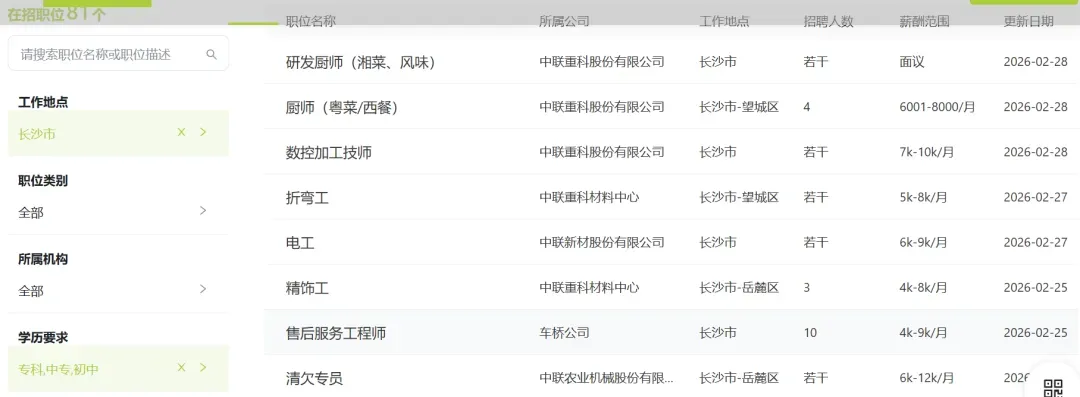 社招:工作地点选择长沙,学历要求选择专科、中专、初中