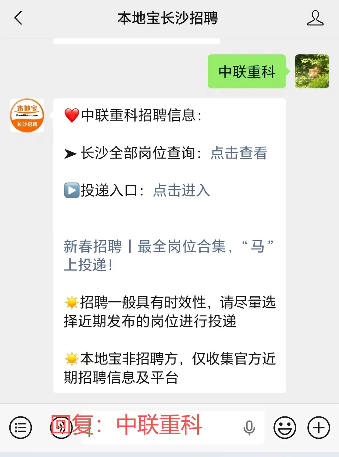 扫描下方二维码,进入【本地宝长沙招聘】,在对话框回复关键词【中联重科】,即可快速进入中联重科招聘官网获取招聘详情、简历投递入口等信息。