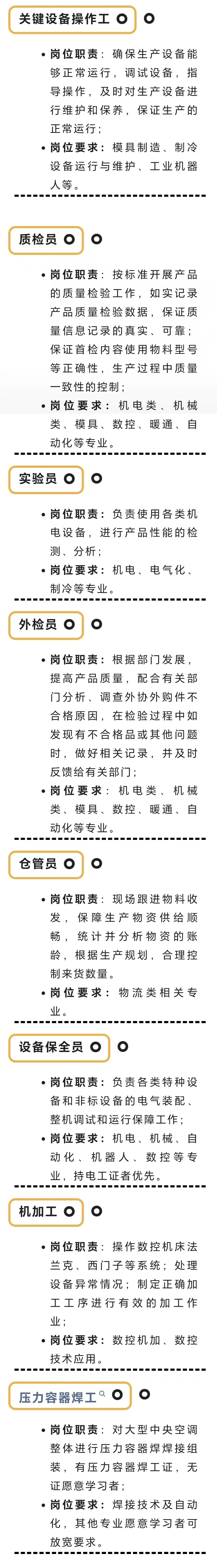 招聘岗位:一线生产操作工,负责空调及其零部件的制造加工或成品装配,工作简单易上手。