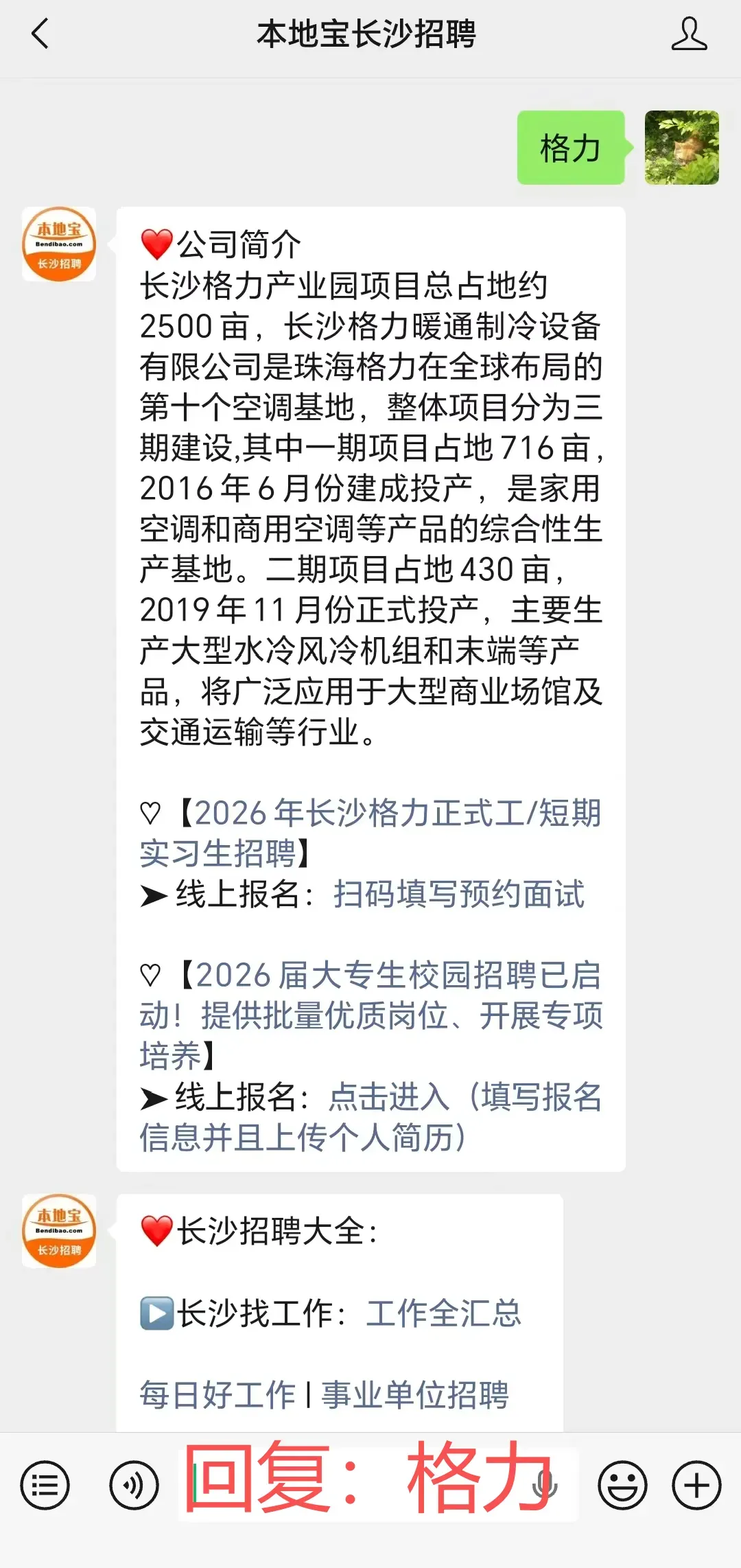 扫描下方二维码,进入【本地宝长沙招聘】,在对话框回复关键词【格力】,即可快速进入获取格力招聘详情、面试预约登记等信息。