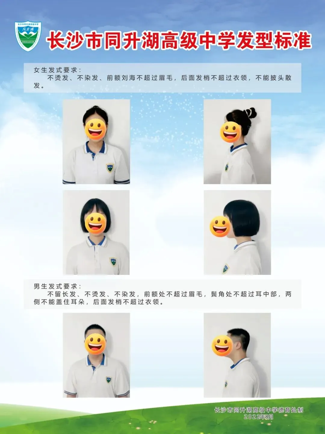 男生头发不烫染,前不遮眉,侧不遮耳,不得理球头、闪电头、锅盖头等奇怪发型;女生不化妆,头发不烫不染,不披散长发,束马尾或自然短发。所有学生剪好指甲,不做美甲,不戴首饰等。入校班主任和德育处将严格检查,对于不合格的学生将责令整改后方可入校。