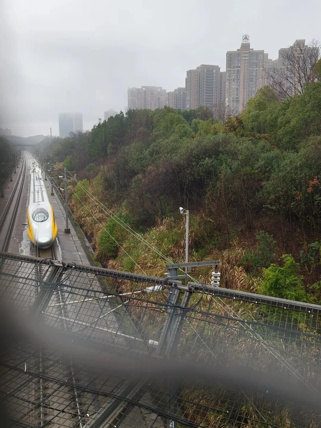 在长沙县,有一趟不载客的黄色高铁,比网红列车更难偶遇。它就是京广高铁的“全科医生” 高速综合检测列车,江湖人称“黄医生”。昨天,睿哥这个高铁迷,得到小道消息,说今天早上,“黄医生”会从长沙南站发出,检测武广段。他可要把握这千载难逢的机会,去看看。这可把他忙坏了,又是查列车经过路线,又是查最佳观赏点位,然后确定在星沙公园蹲守。因我和他爸都有事,他只能自己前往。他早早收拾好拍照手机、手机支架,定了十个闹钟,6点起床,自己坐公交车去。我的天哪,这个十二岁的小孩儿,哪来的这么大的热情呢!我担心不安全,试着劝退。他说没事儿放心。我说太早了你起不来,他说绝对起得来。我又说,会下雨呢,他说我带伞。第二天早上,我把哥哥送到学校,发消息给他:起来没?好吧,又帮他确认了一下下车的站点,结果表明我还没他清楚,算了,不瞎掺和了,男孩子天生对路线比较敏感。几分钟后给我发消息说上车了。我说好,到了发个位置给我,我去找他汇合。片刻之后给我发了位置,是我们经常去的那个地点。他之前在这里拍了无数次的高铁。我到达的时候,雨下得很大。他撑把伞在桥上,透过铁丝网向前张望,看我来了,兴奋地跟说我,刚刚过去了一趟什么型号的高铁,司机还鸣笛了,不知道是不是跟他打招呼。哈哈,这小伙子还挺拿自己当回事的,人站在桥上,司机看得见嘛?我也不行打击他,且让他乐吧。陆续过去了几辆高铁,有白的,有红色的,像灵蛇舞动,还有一辆像兔子的,睿哥说这是从外国引进的一个型号。让我惊讶的是,他能背出每趟车的型号,看来这是真爱啊!雨时大时小,我头顶上的一把旧伞,竟然从里面滴水了,抬头一看有几个针眼大的洞,用久了,磨损的,雨水是从这些地方漏下来的。睿哥让我到他的伞下面去,我说没事,顺手戴上了棉袄上的帽子。等了快一个小时了,我怕列车晚来或者不来,这个痴小孩儿等起来没完。早点打防疫针:再过15分钟要是还不来,我们就回去哦。我又没忍心拒绝,这么久都等了,不差这几分钟,等吧。就在这时,远处的隧道里出现了两个光点,我俩兴奋起来,应该是它来了!我找好角度,打开手机的相机,调好焦距,一切就绪,只等它入镜了。桥面有些微微地震动,列车急速驶来,光越来越亮,近了,黄色的车身,是它,没错了!睿哥开心地夸我拍得不错,可以当他的御用摄影师了。这马屁拍的!不知道是夸我还是夸他自己。武广高铁纵穿星沙生态公园,这座观景亭就在防护网外的公共区域,视野无遮挡,是长沙县公认的“高铁摄影C位”。不用追着线路跑,在这里就能拍到“黄医生”与绿意同框的大片。