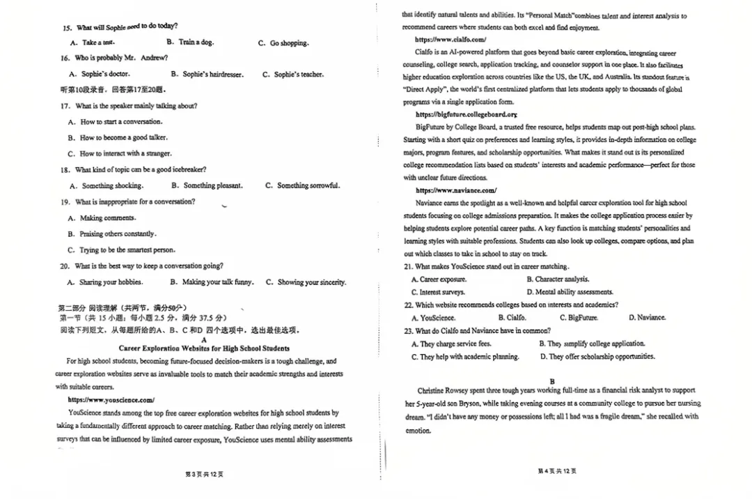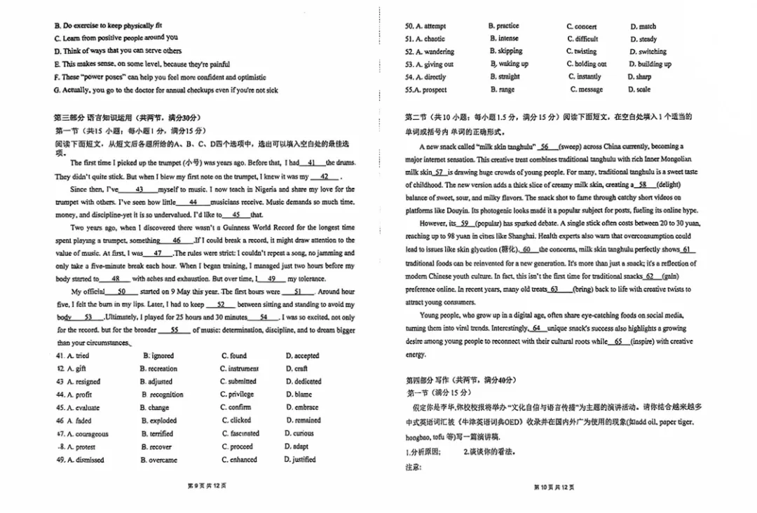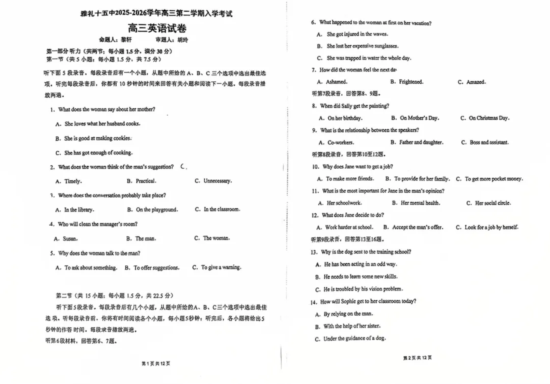 >湖南省长沙市雅礼十五中学2025-2026学年第二学期入学考试高三英语试卷