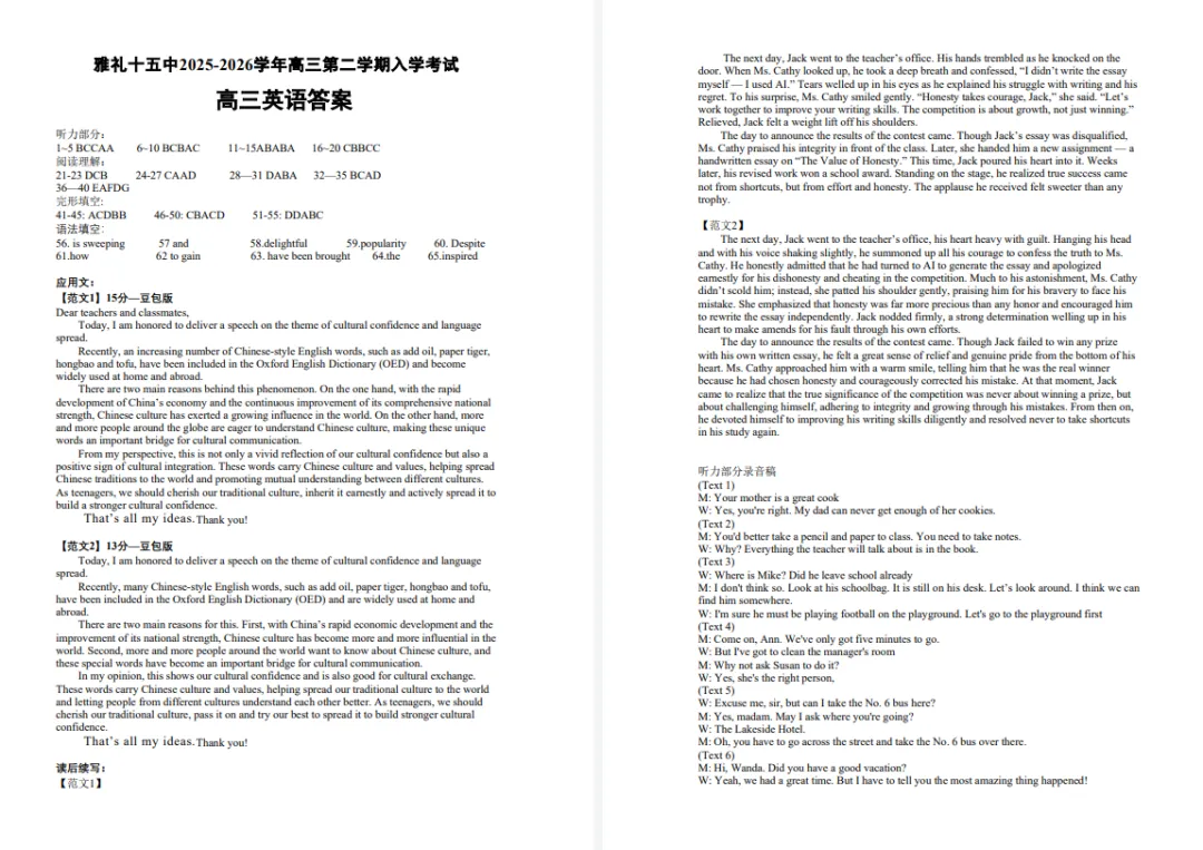 湖南省长沙市雅礼十五中学2025-2026学年第二学期入学考试高三英语试卷