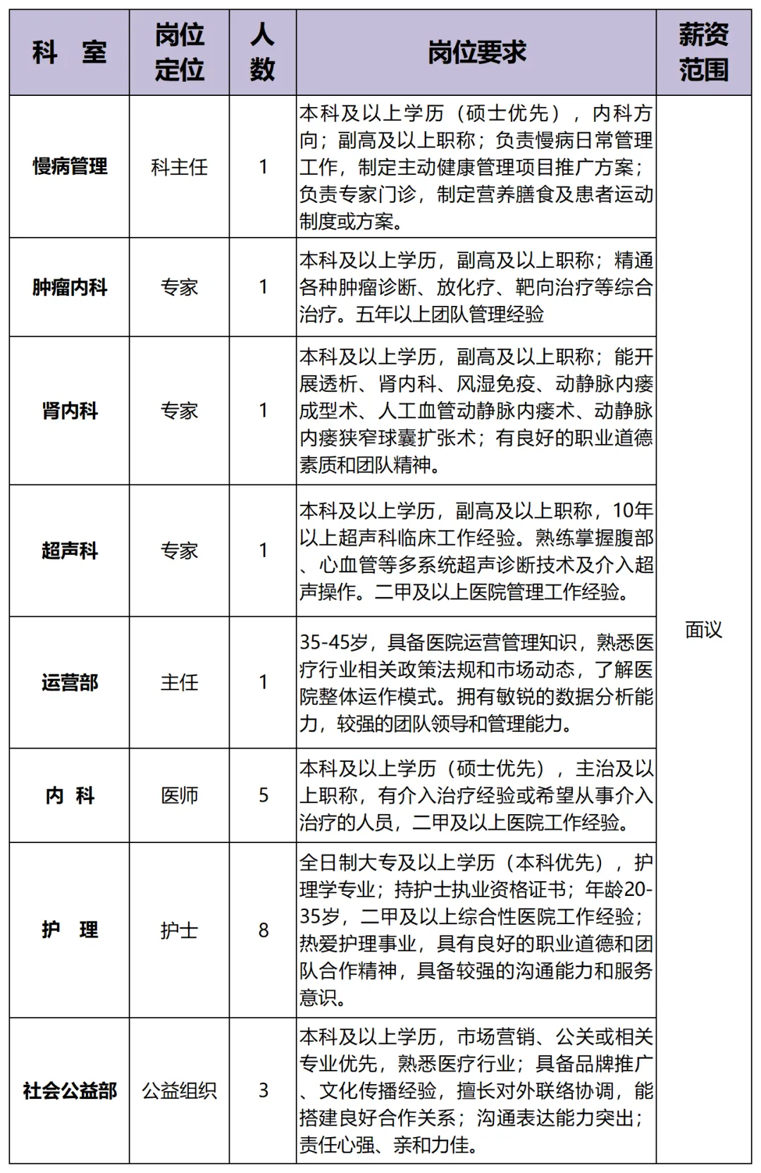 面向有经验的医疗从业者,我们提供 “核心岗位+优厚待遇+管理权限” 的发展组合,期待您以专业实力带领团队突破,以管理经验推动科室发展。