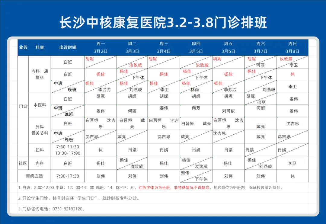 【就医资讯】长沙中核康复医院2026.3.2-3.8门诊排班表