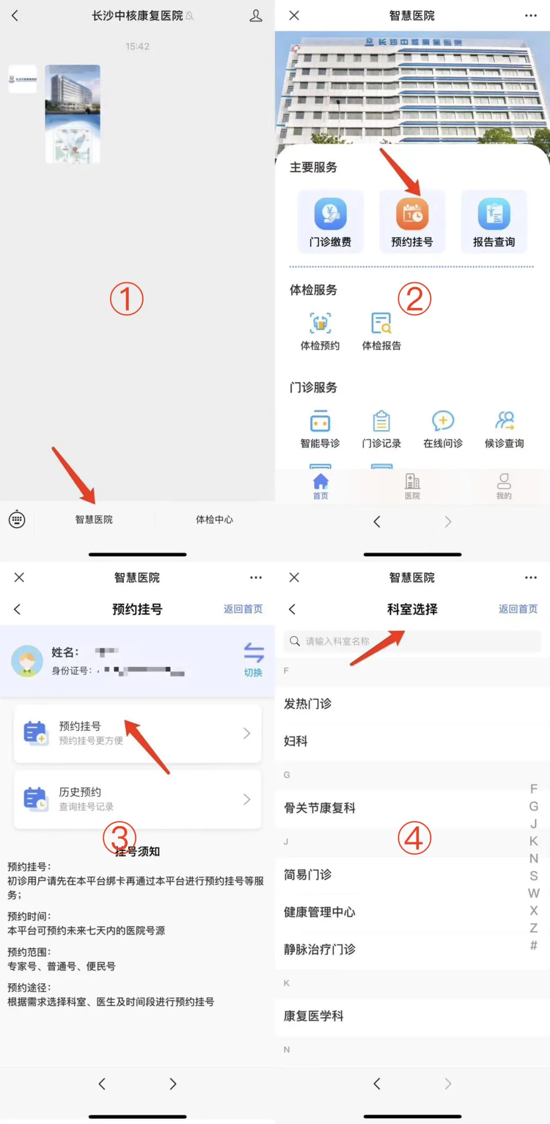 扫码进入“长沙中核康复医院”微信服务号、菜单栏点击进入【智慧医院】、进行【预约挂号】、选择【对应科室】。体检预约咨询: 0731-89897788,19974939199