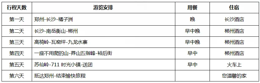 1.交通:郑州-长沙高铁,郴州-郑州卧铺,当地空调旅游车,保证一人正座;(火车硬卧不指定下铺)