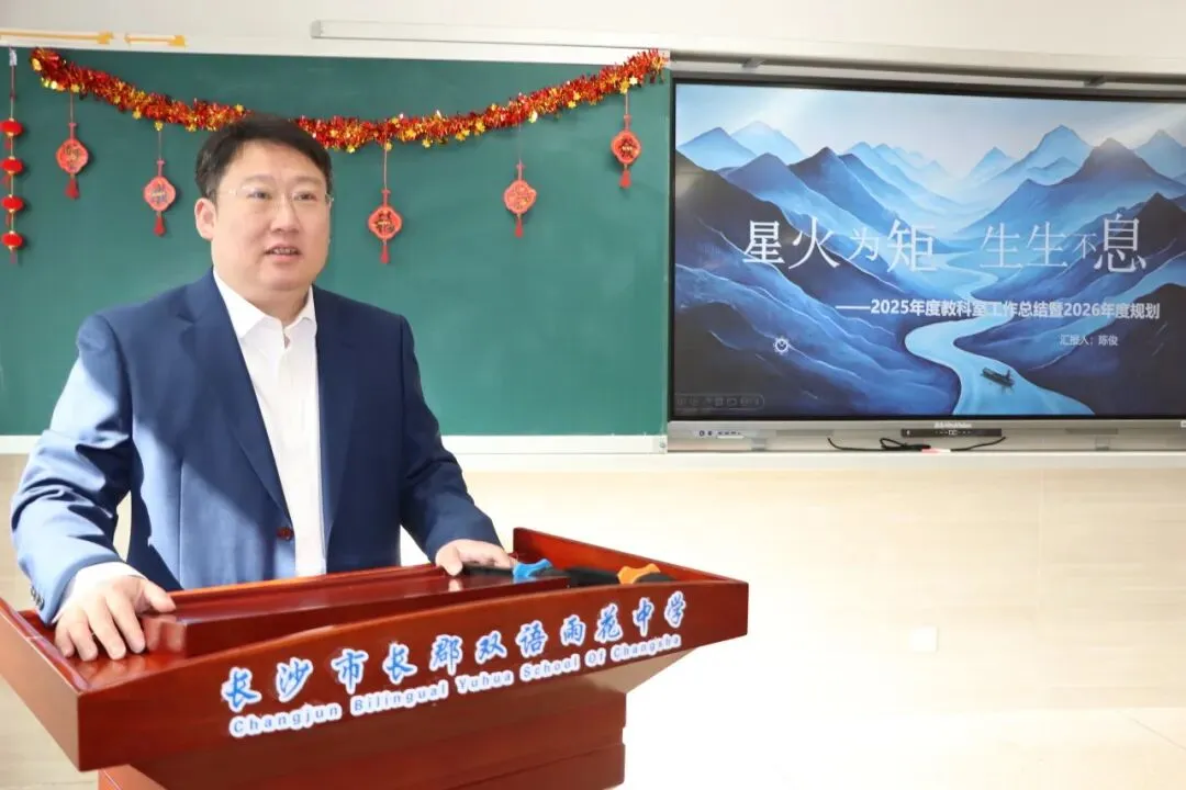 教科室主任陈俊以“教研提实、研究提质、成长提速”为年度主线,重点汇报了在强化集体备课实效、深化听评课体系、推动学科活动课程化、助力教师专业竞赛等方面取得的突出成果,并详细阐述了2026年以“星火计划”为抓手,构建“学科活动—课程建设—教研共生”三位一体成长型教研组的发展蓝图。