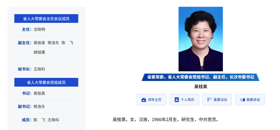 日前,湖南人大官网“领导之窗”一栏更新显示,长沙市委书记吴桂英已正式出任湖南省人大党组书记、副主任。