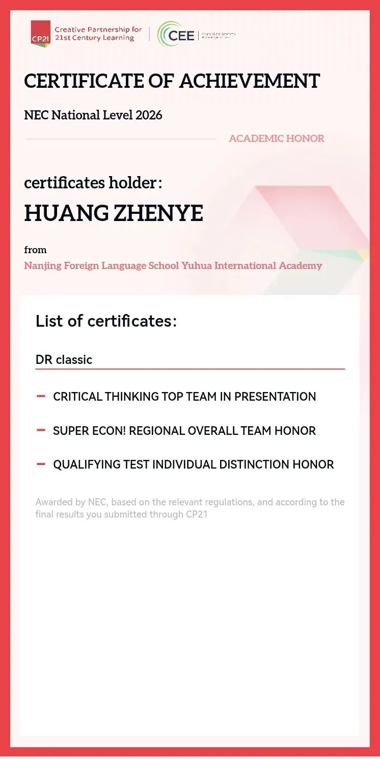 2026年2月27日至3月1日,备受瞩目的CNEC(原NEC)经济学素养研习活动中国站于湖南长沙盛大举行。在这场被誉为经济学界“奥林匹克”的顶级盛宴中,南外雨花国际高中的黄同学凭借初赛的出色发挥斩获全国赛入场券,代表我校奔赴国赛赛场,在高手如林的舞台上书写了一段关于勇气、协作与成长的精彩篇章。