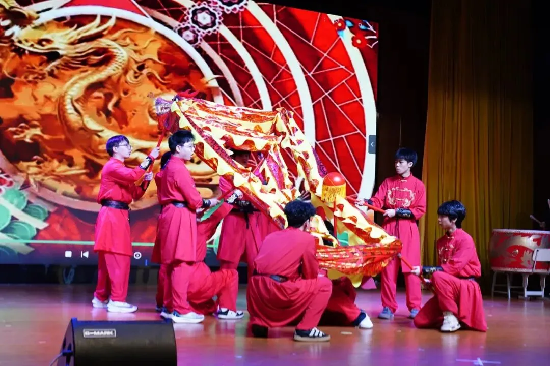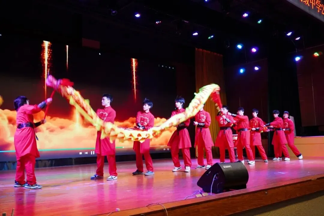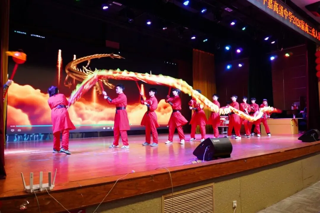 暖场视频串联起三年珍贵瞬间,2302班学子带来的舞龙表演,龙腾虎跃间,尽显中嘉少年的昂扬朝气与青春风采。