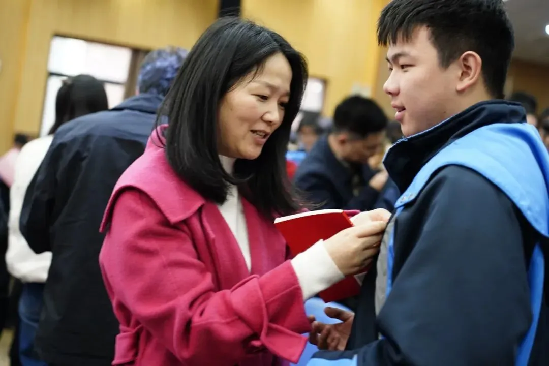 成人礼仪式的核心环节,庄重而神圣。校长王德复与副校长周俊杰共同为各班学子代表佩戴“中嘉成人纪念章”,并向每一位少年赠送《中华人民共和国宪法》。