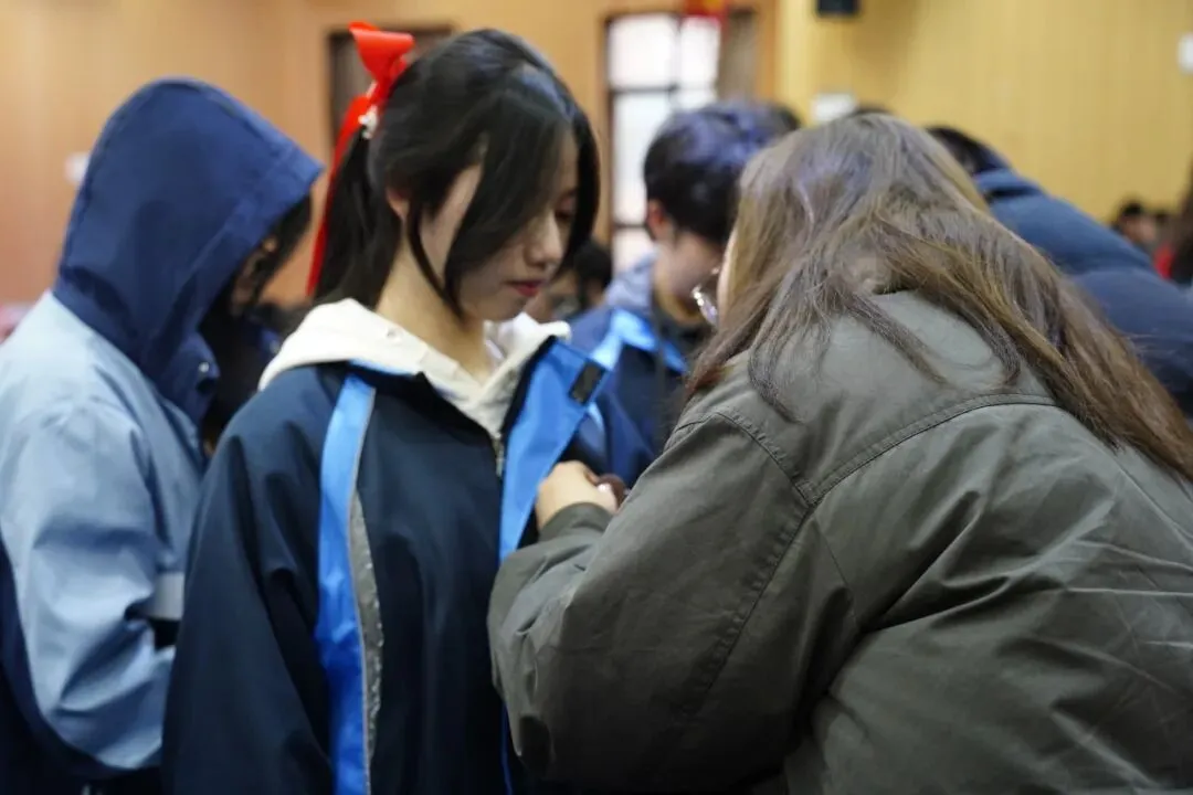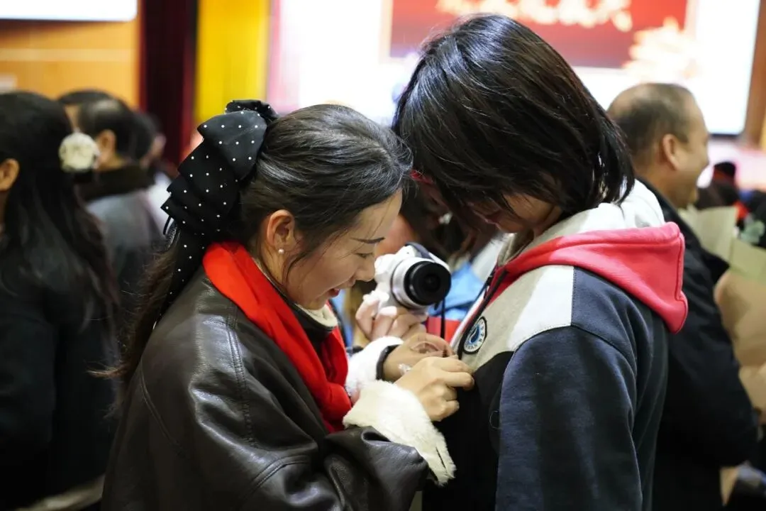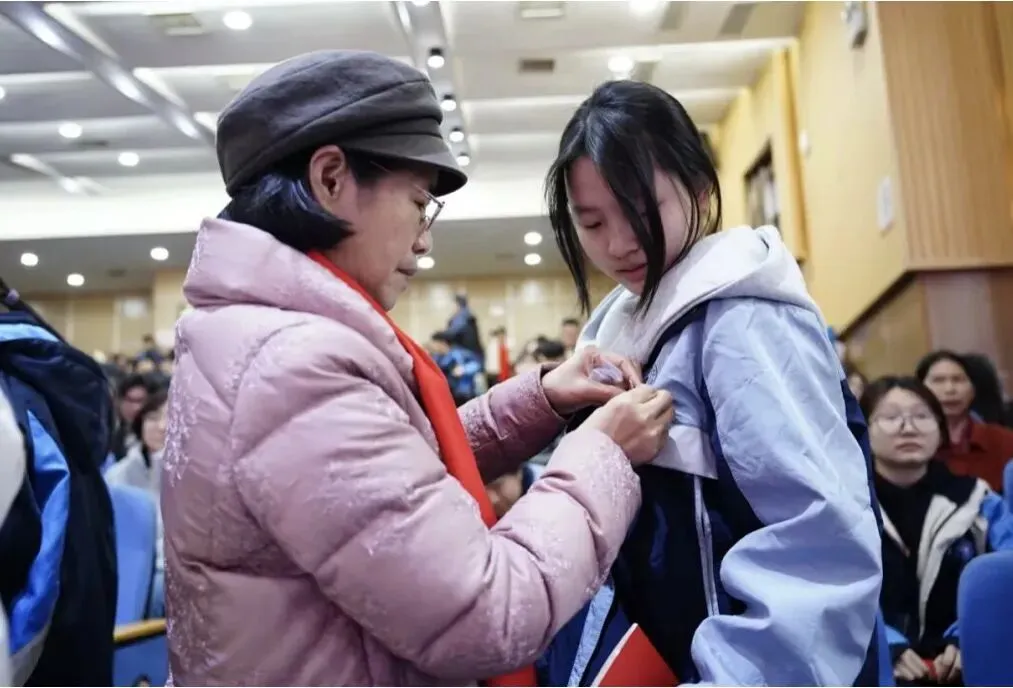 随后,家长们亲手为自己的孩子佩戴徽章,将《中华人民共和国宪法》交到孩子手中。这是成长的勋章,也是公民的契约。当学子们向父母深深鞠躬,一句“谢谢”,道尽十八年养育深情。