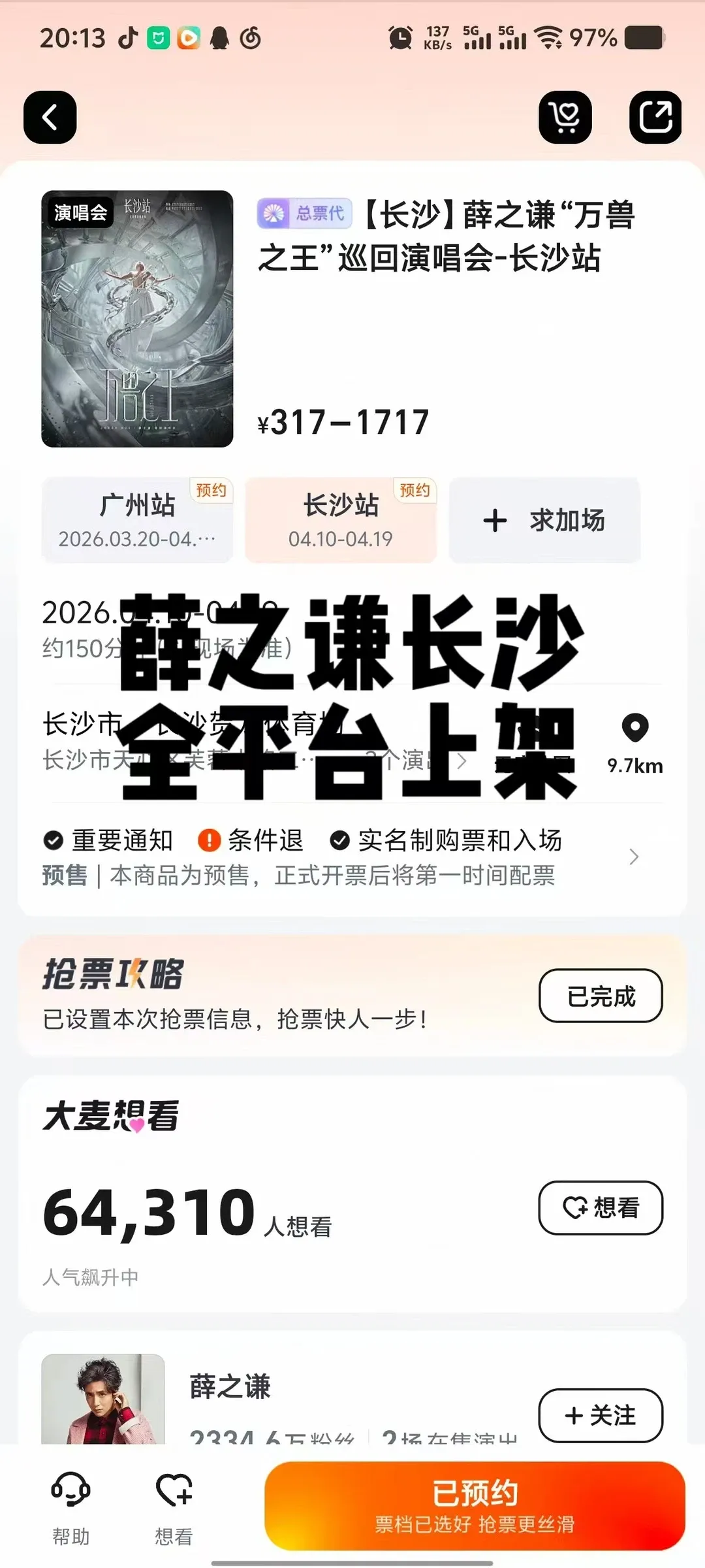 ✅演出:薛之谦「万兽之王」2026巡回演唱会长沙站