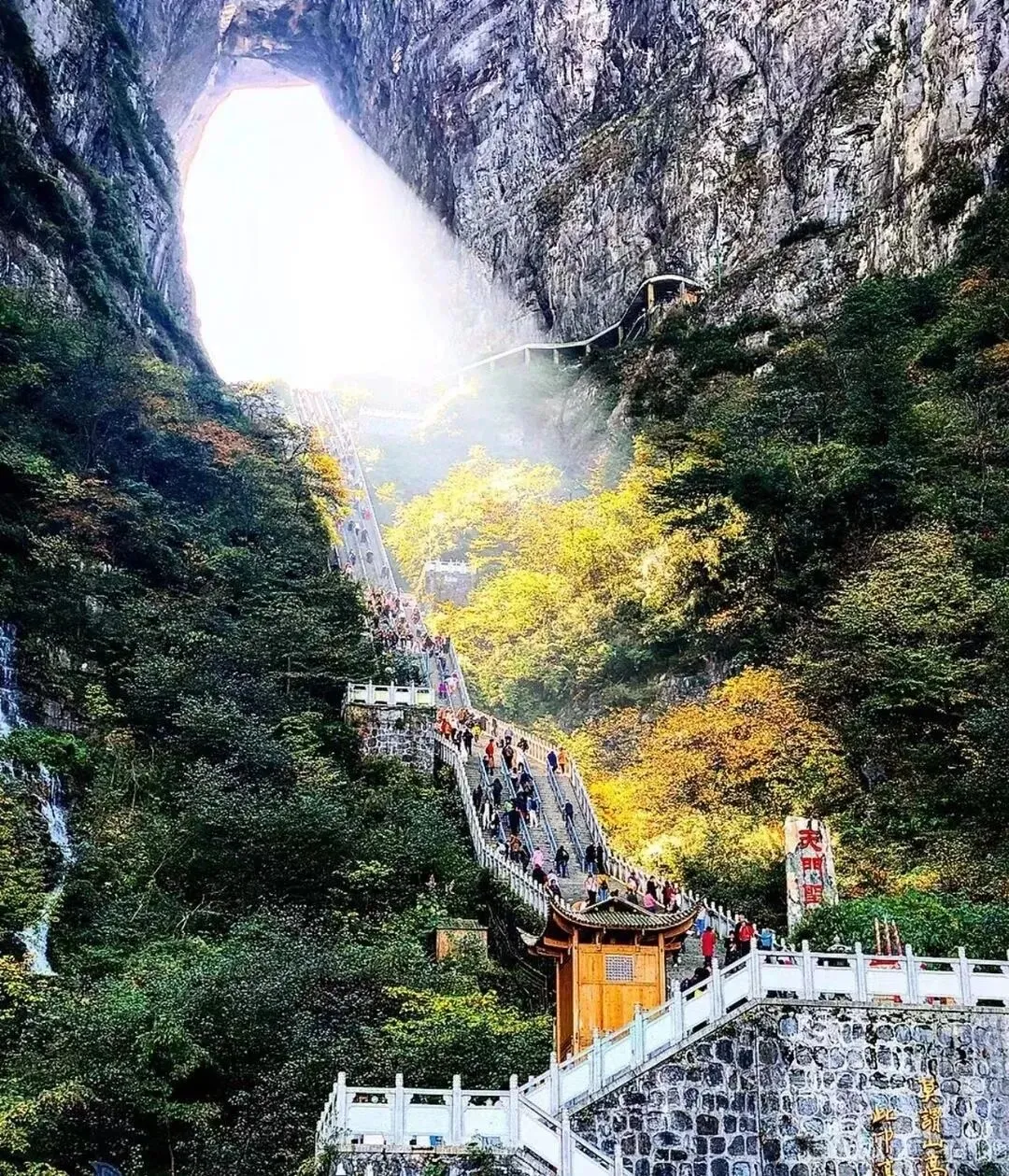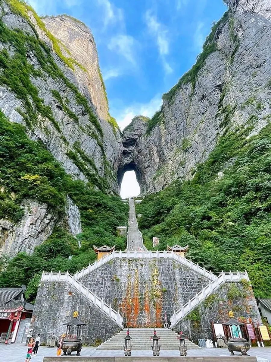 早餐后,前往游览张家界之魂的湘西第一神山【天门山国家森林公园】(包含大门票+大索道+环保车+保险+玻璃栈道+天门洞,游览约4小时左右),乘坐世界最长的高山客运索道—天门山索道(全长7455米,高差1270米,大约38分钟),体验凌空飞仙般的神奇感觉;空中欣赏壮丽的山水画长卷,直达天门山山顶,游览“天门十六洞”之称的求儿洞,观鬼谷洞景点,远眺鬼谷仙洞;领悟古代哲学思想的深邃,感受“天下第一公路奇观”九十九道弯及九百九十九个台阶通天大道的惊奇体验;感受造化神奇的“99世飞赛”四架飞机同时穿越此洞的震撼惊奇,尽情欣赏天门洞内外的壮丽景色,你还可以体验惊险刺激的【天门山玻璃栈道】:悬于山顶西线,长60米,最高处海拔1430米。