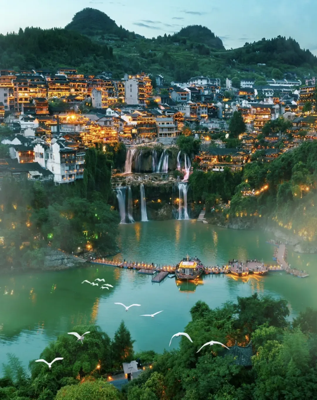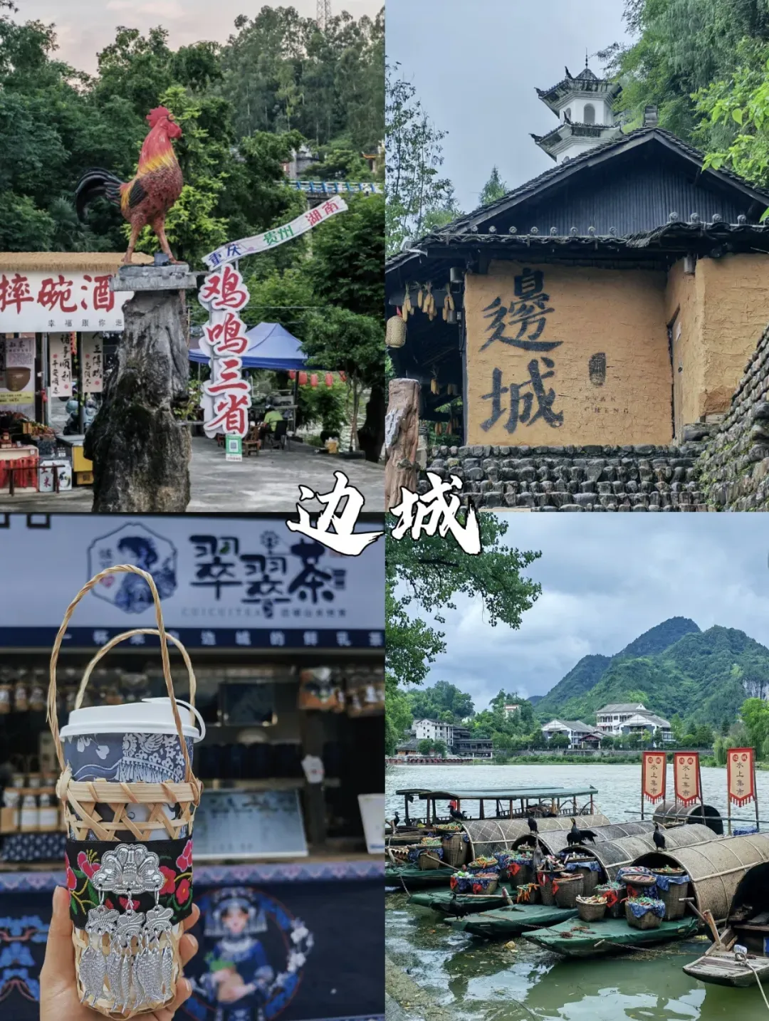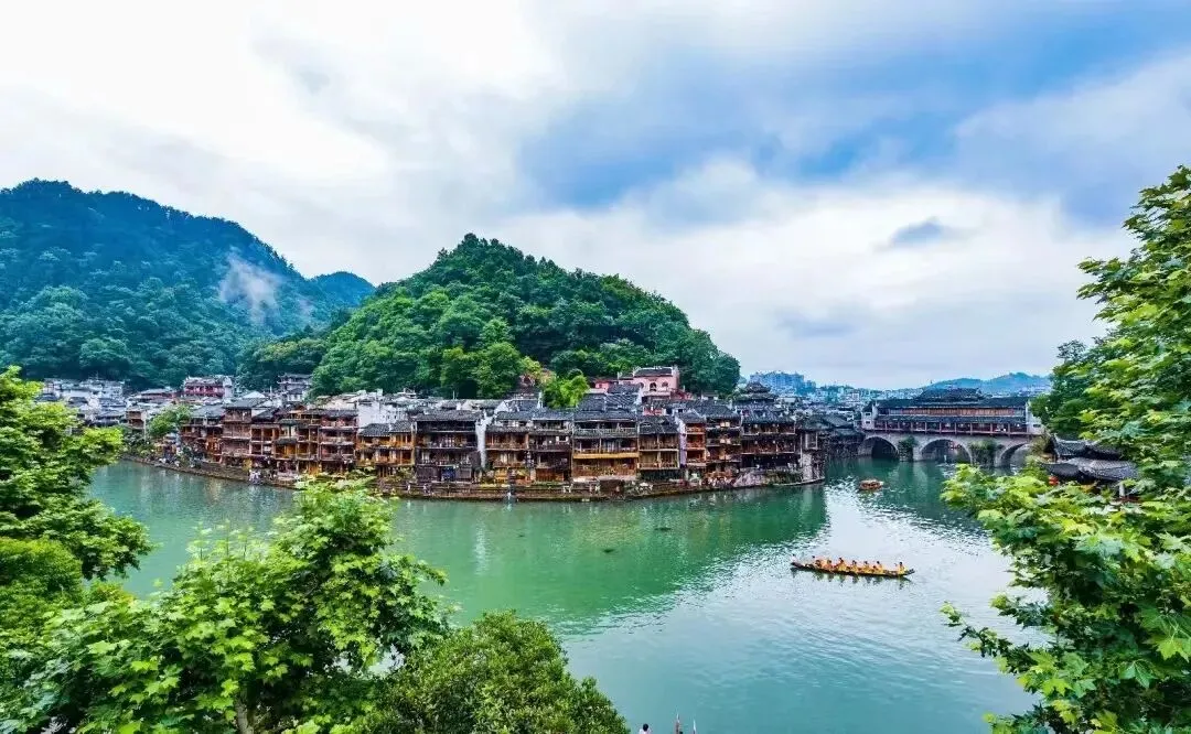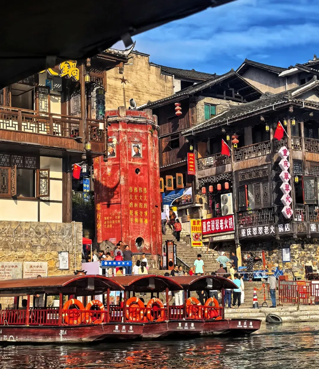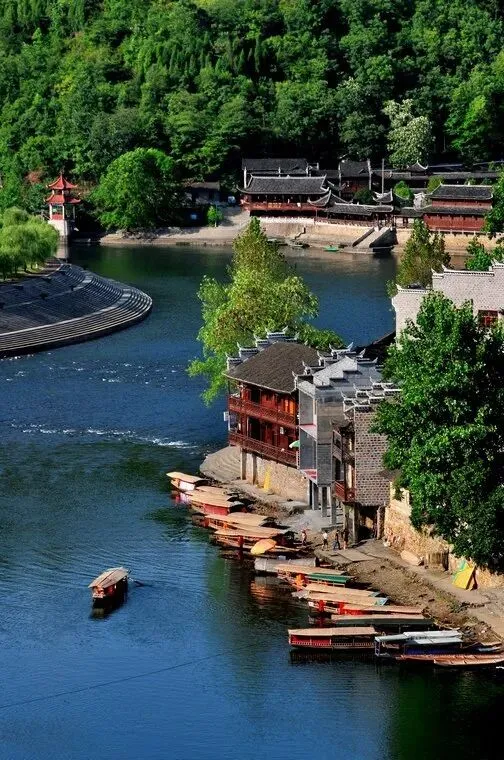 前往“一脚踏三省”,沈从文先生笔中的茶峒《边城》(游览时间约2小时)茶峒优美的风景、善良的风俗和淳朴的人情等融为一体,勾画出田园牧歌般的边城风,乘乌蓬船在欣赏河流中的【翠翠岛】(不能上岛)因为《边城》,闻名遐迩。翠翠已化身为一尊高约十米的石像与她的那一只狗翘首在河中央的石滩上,等待着她所期盼的人从远方归来。