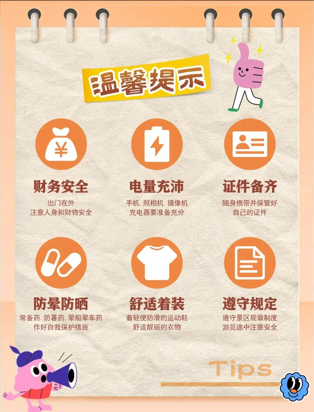 7、行程中如有温泉、请准备好泳衣泳裤,参与前必须严格遵守各项景区景点规定(景点均有安全须知公示)。