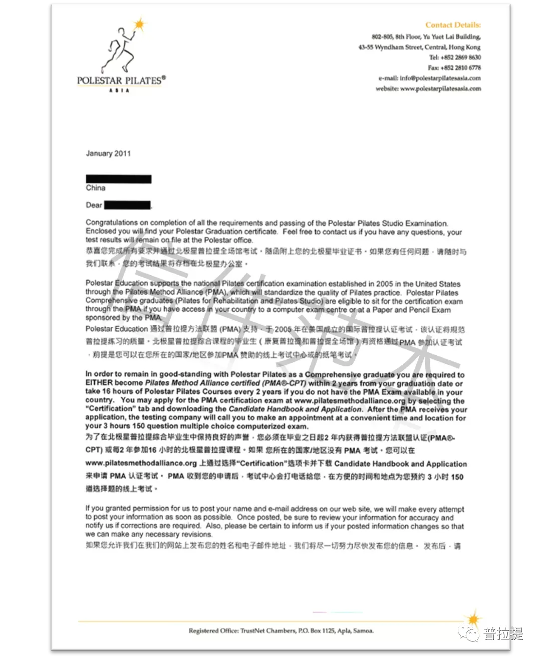 只有获得考试通过的同学才会获得北极星普拉提颁发的北极星普拉提国际认证证书和信件。