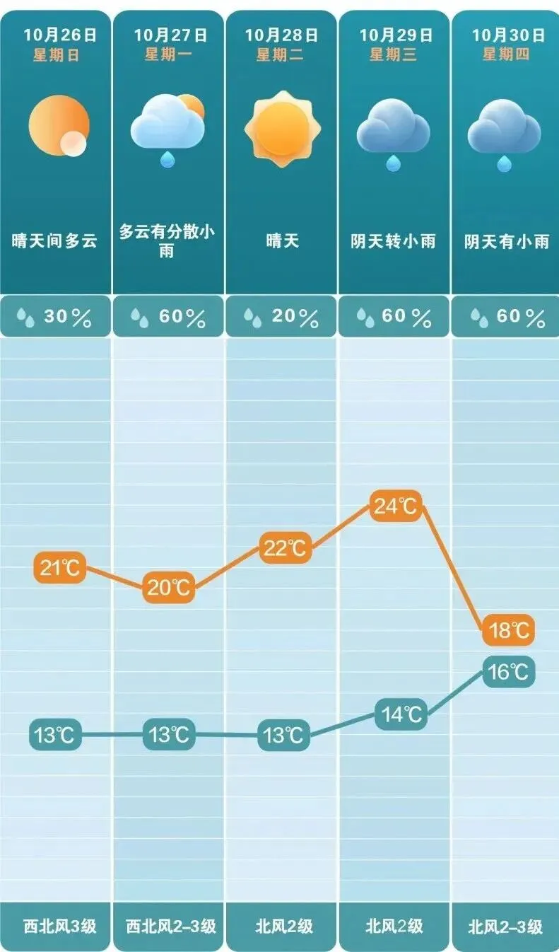 记者注意到,本周日(26日)是晴天间多云的好天气,西北风3级,最高气温21℃,体感舒适,适合户外活动;27日天气突然“变脸”,多云有分散小雨,降水概率达60%,最高气温维持在20℃;分散小雨“捣乱”后,28日长沙迎来大晴天,虽然最低气温仍然只有13℃,但最高气温已经升至22℃。