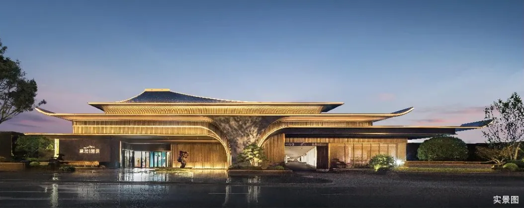 新中式宋韵风格,主出入口大门形似王府,大门屋檐宽约61米,至屋顶高约12.8米,搭配环岛式落客区,气派非常。