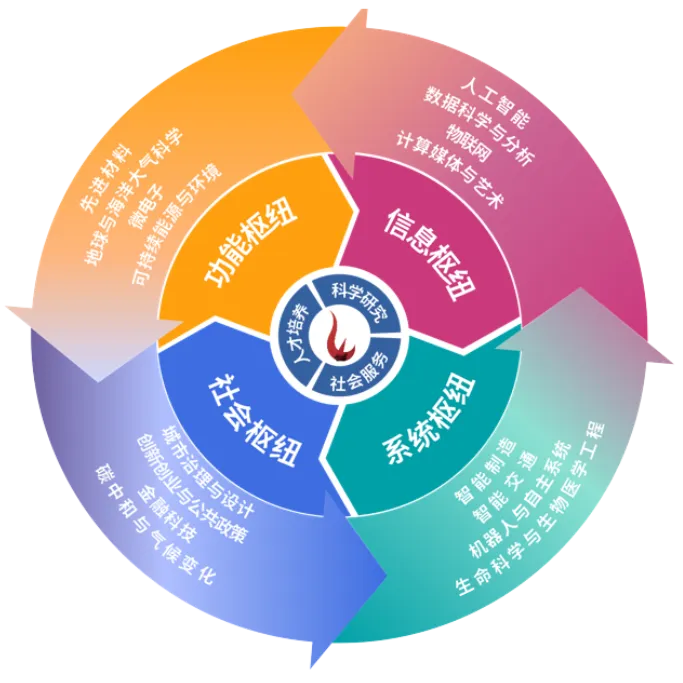 港科大(广州)设置功能枢纽(Function Hub)、信息枢纽(Information Hub)、系统枢纽(Systems Hub)、社会枢纽(Society Hub)4个枢纽,下设16个学域。2023年2月,港科大(广州)成立了教育科学学院(CES)和未来技术学院(CFT)。两院是学校践行“枢纽-学域”融合学科人才培养架构的基石和支柱。
