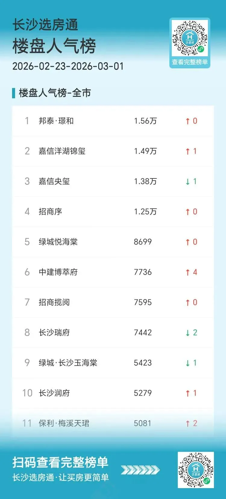 人气榜单方面,上周位列榜单前五位的楼盘分别是:邦泰璟和(1.56万)、嘉信洋湖锦玺(1.49万)、嘉信央玺(1.38万)、招商序(1.25万)、绿城悦海棠(8699),备受市场关注!