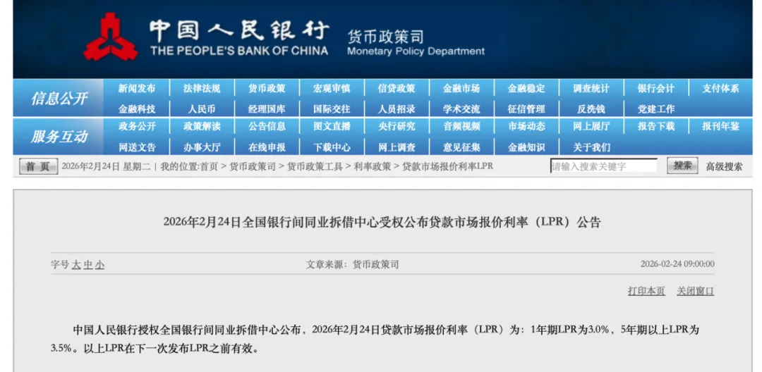 根据公告,2026年2月24日贷款市场报价利率(LPR)为:1年期LPR为3.0%,5年期以上LPR为3.5%。以上LPR在下一次发布LPR之前有效。