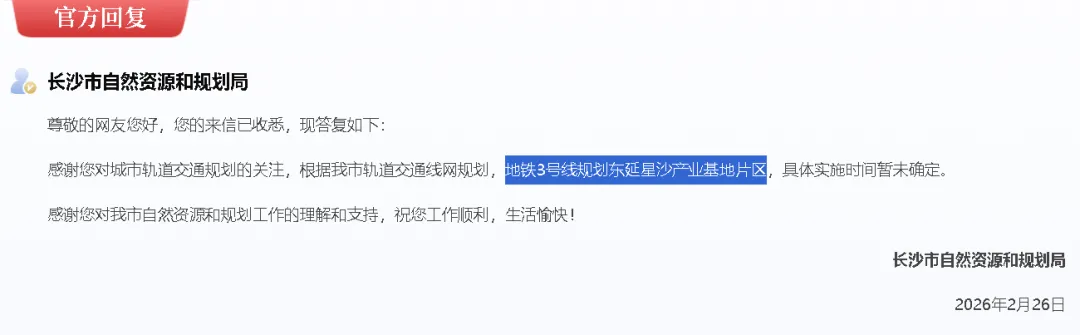 对此,长沙市自然资源和规划局进行了回复,回复称:根据我市轨道交通线网规划,地铁3号线规划东延星沙产业基地片区,具体实施时间暂未确定。