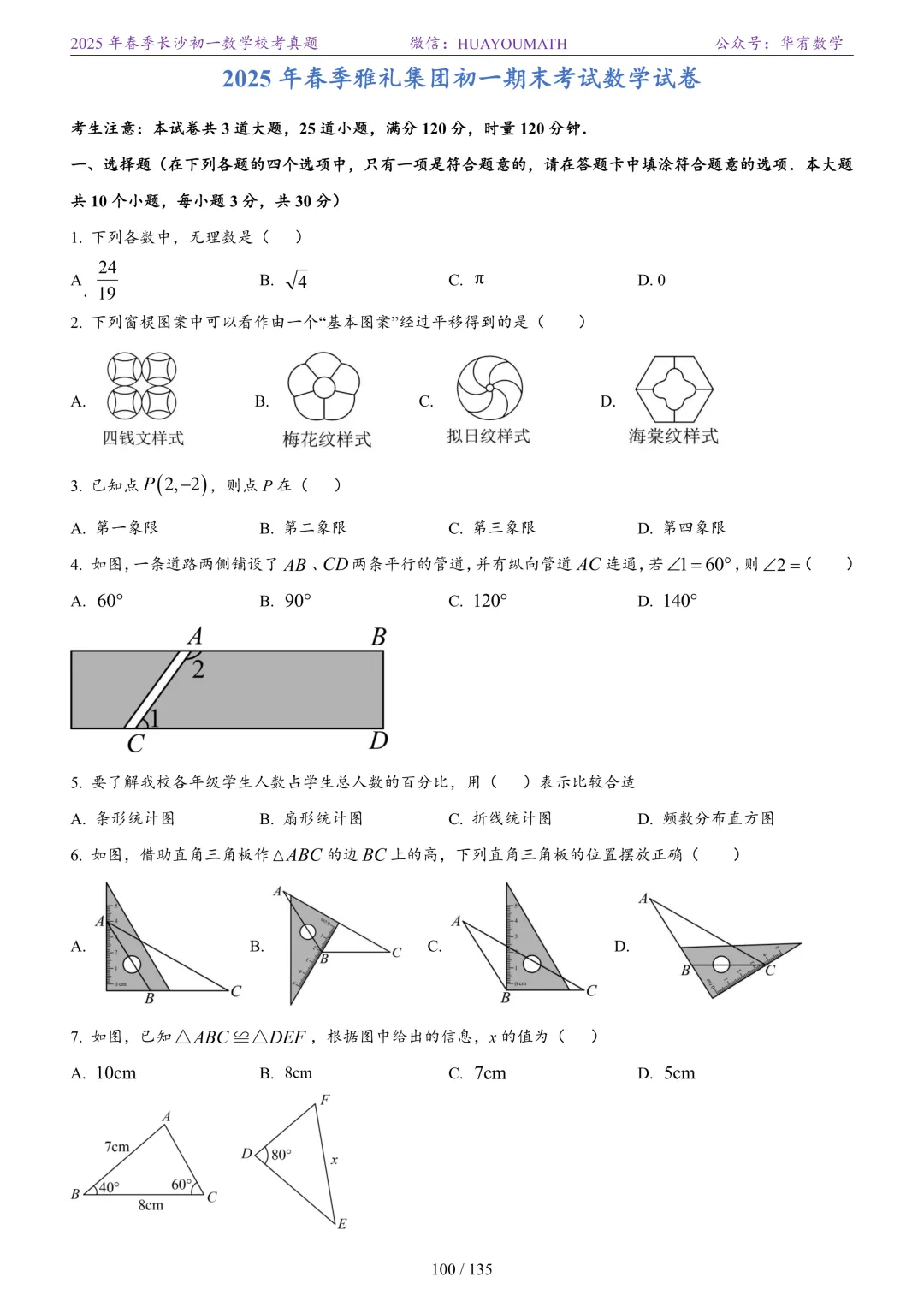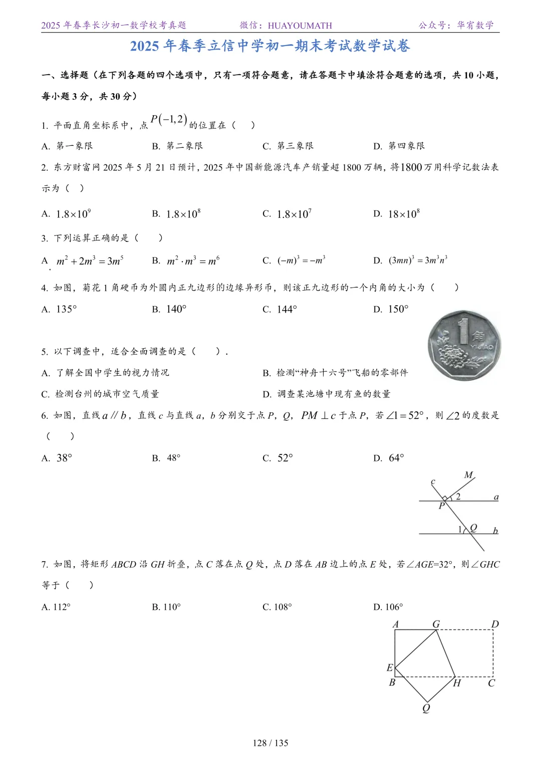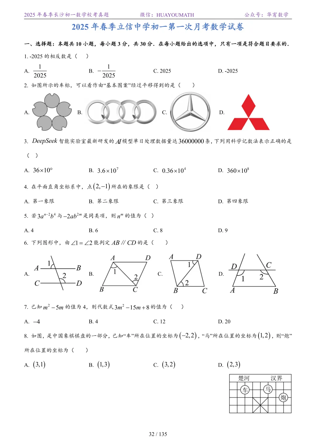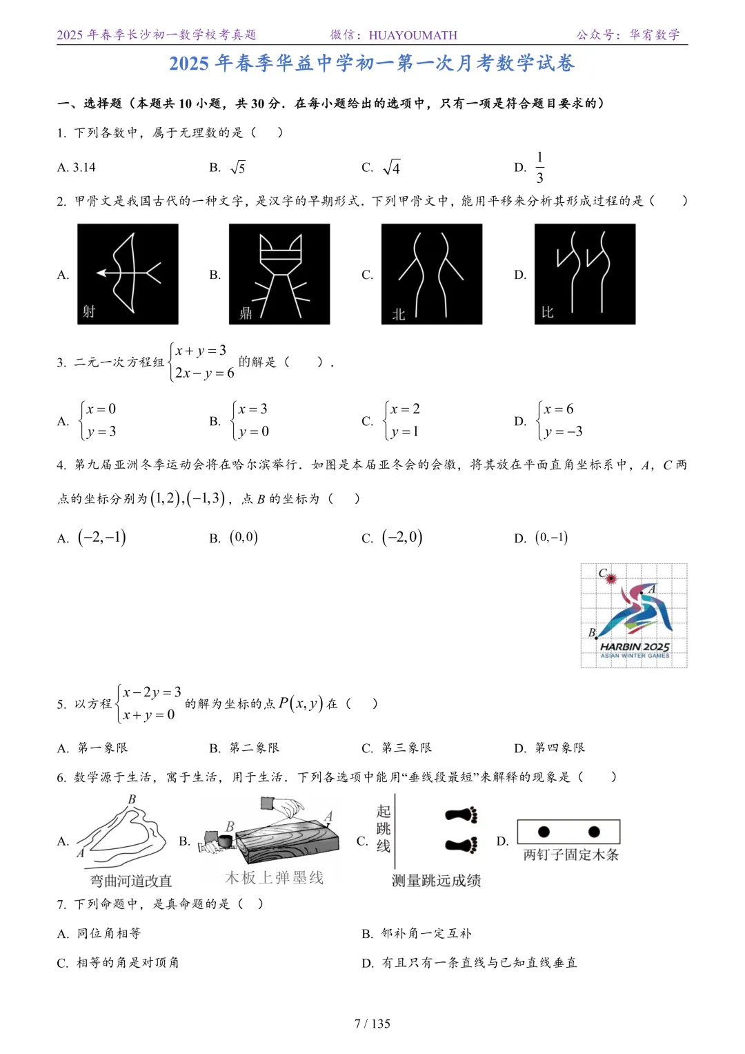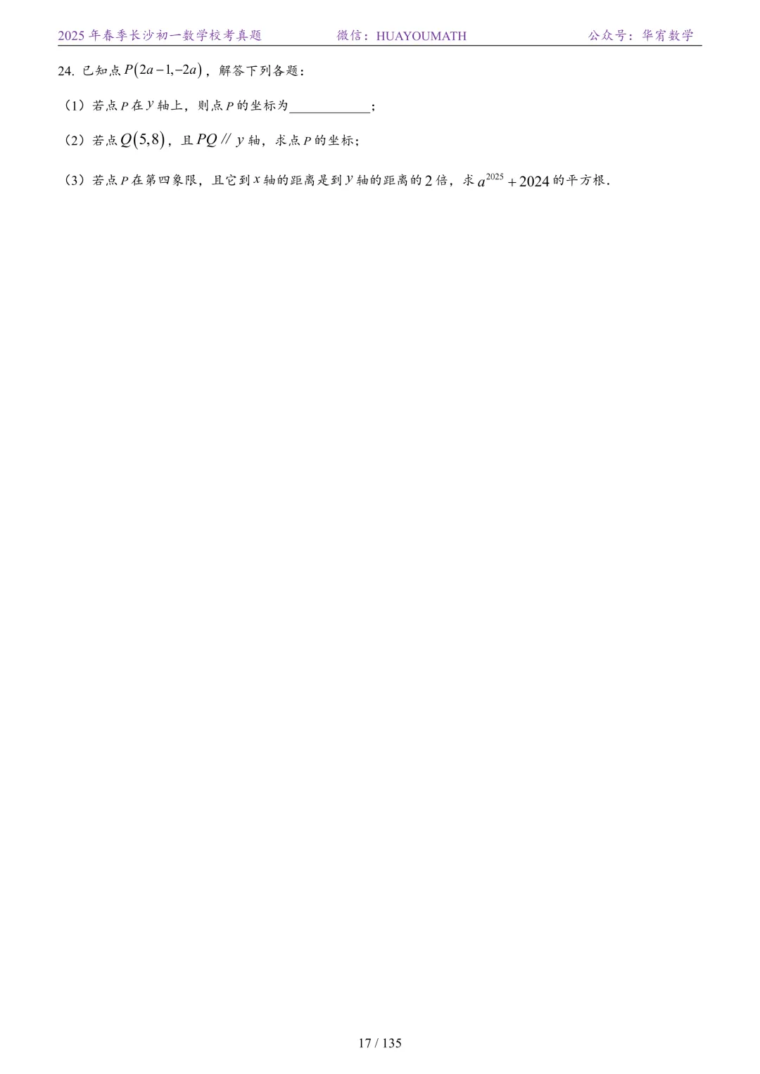 2025年春季长沙初一数学校考真题