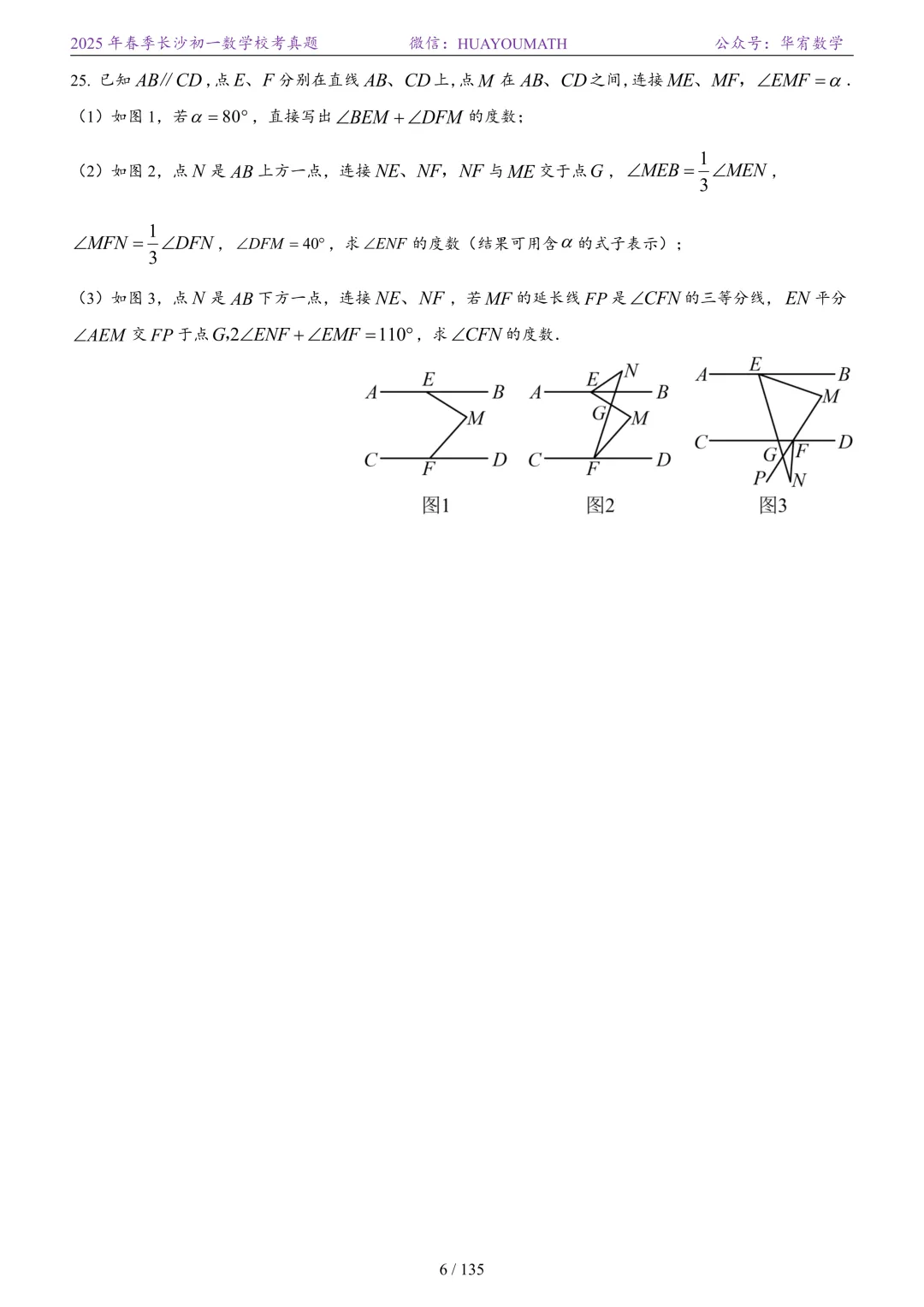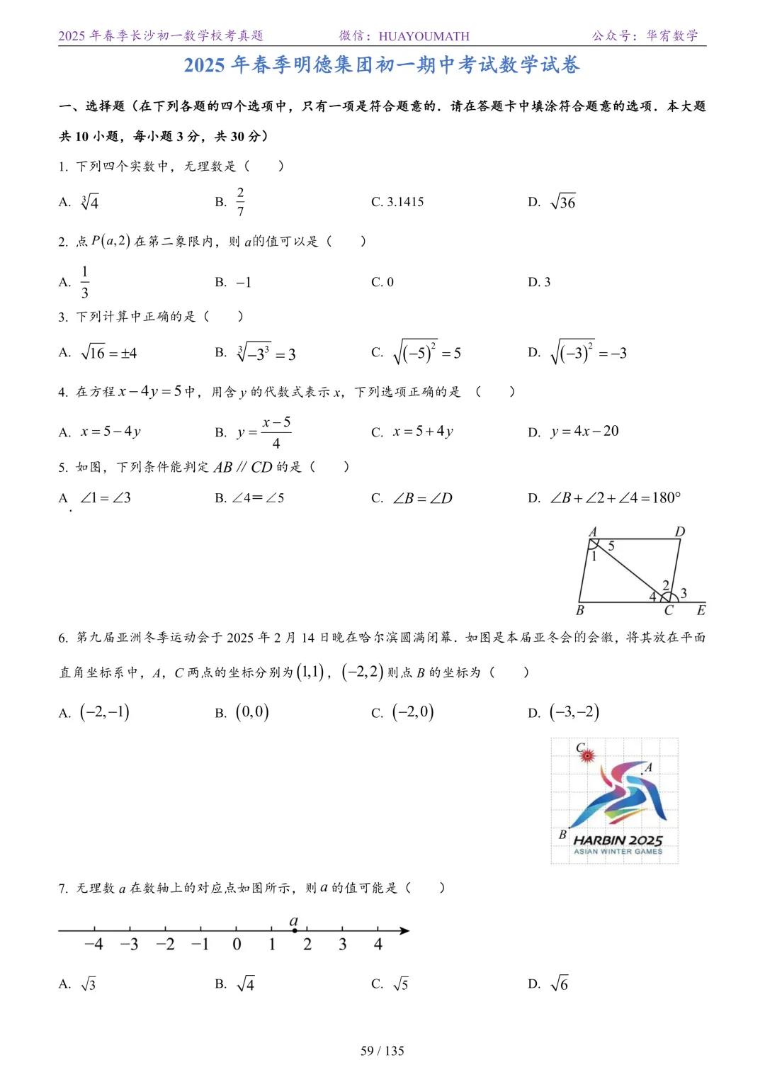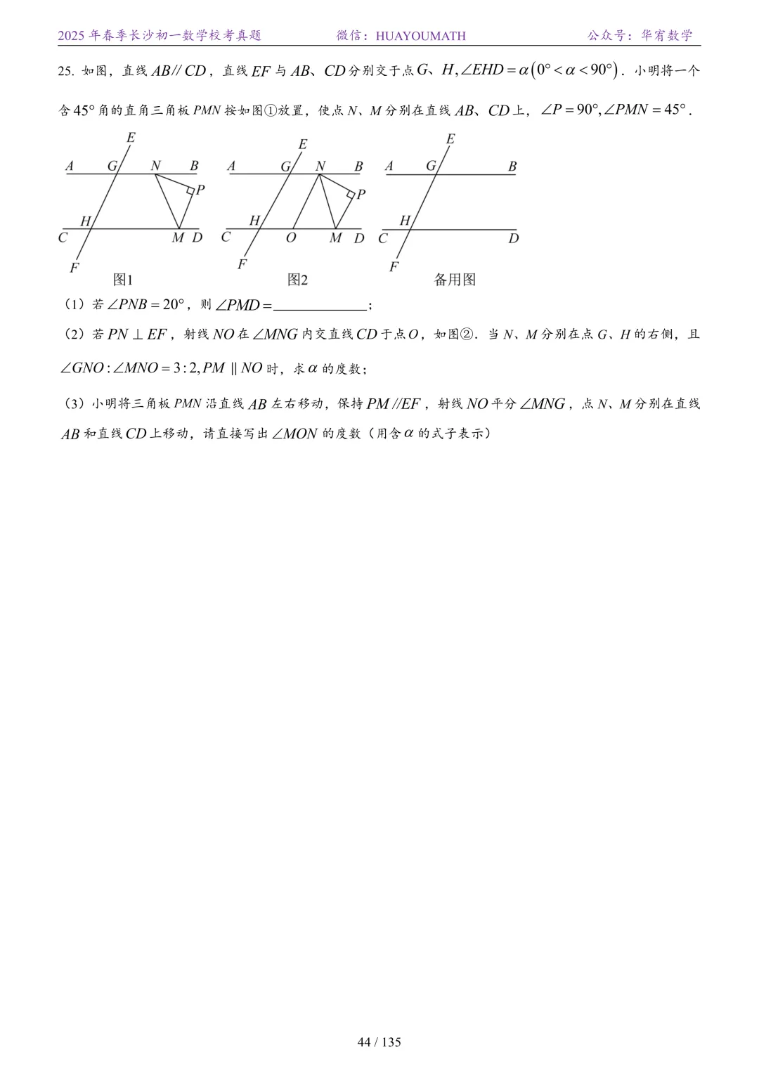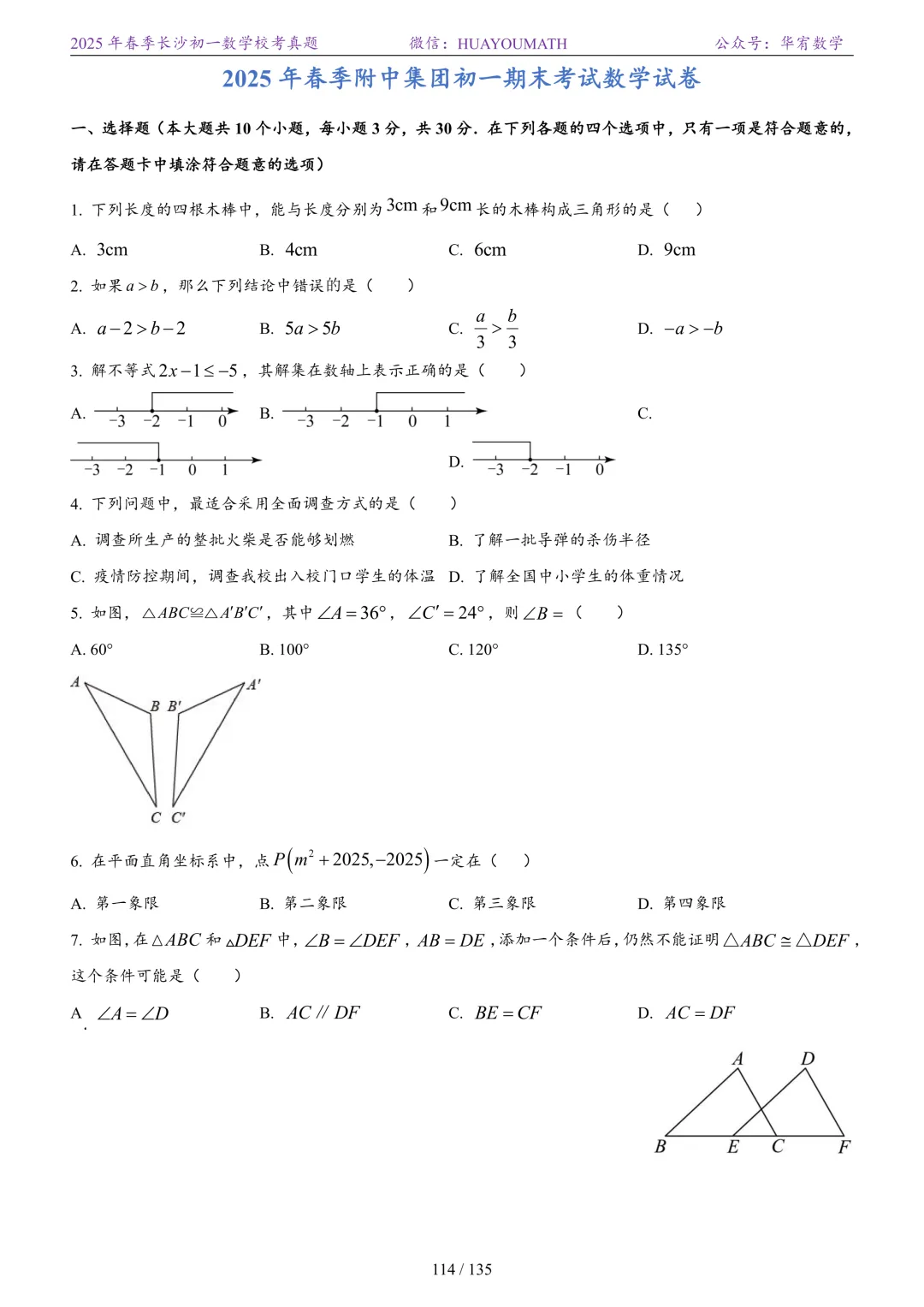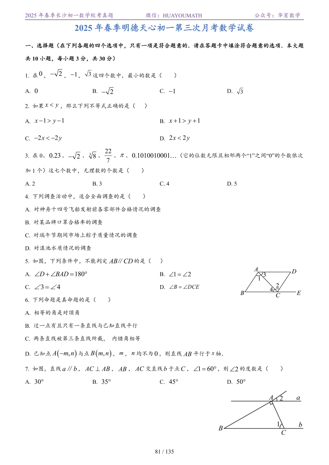 2025年春季长沙初一数学校考真题