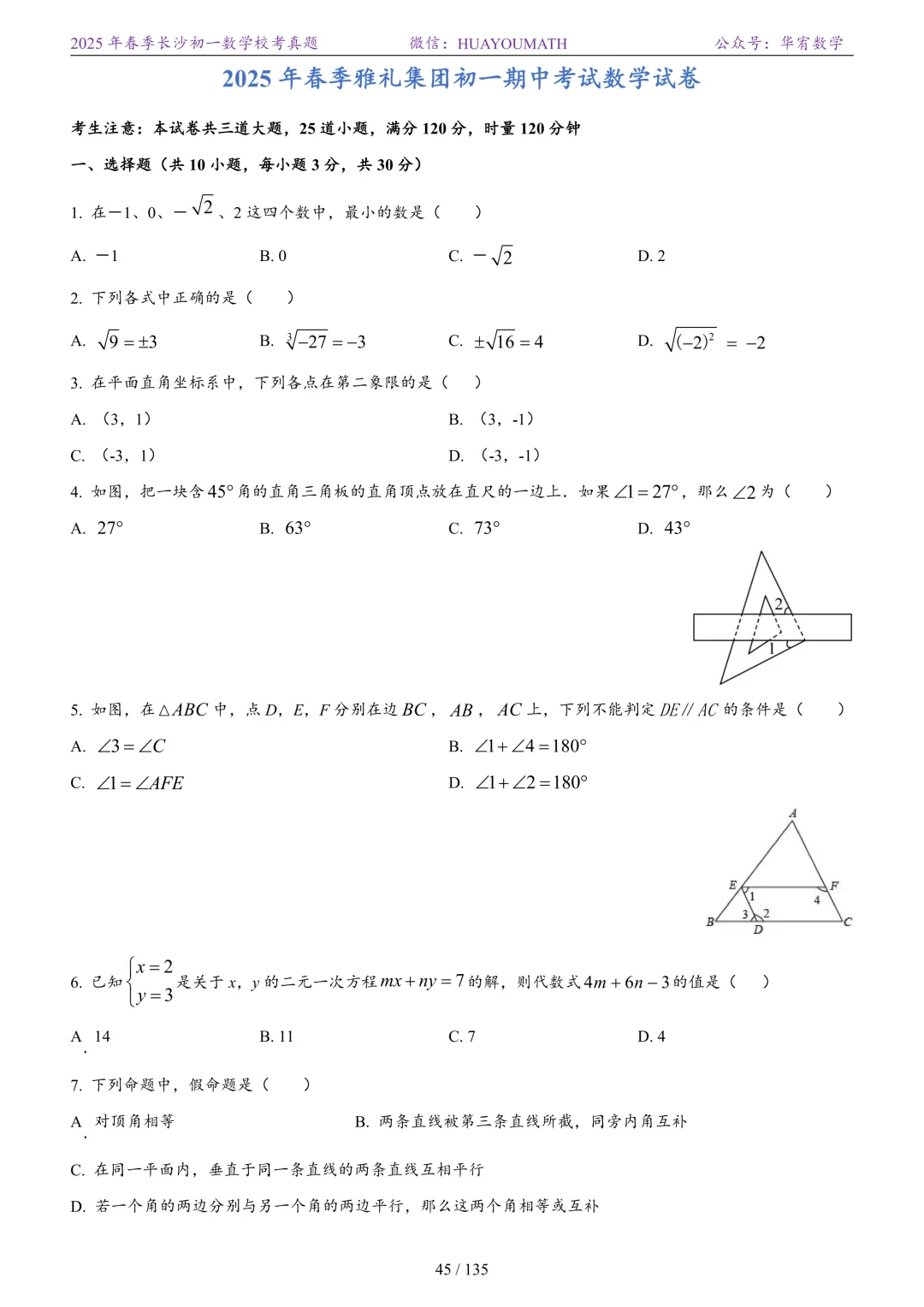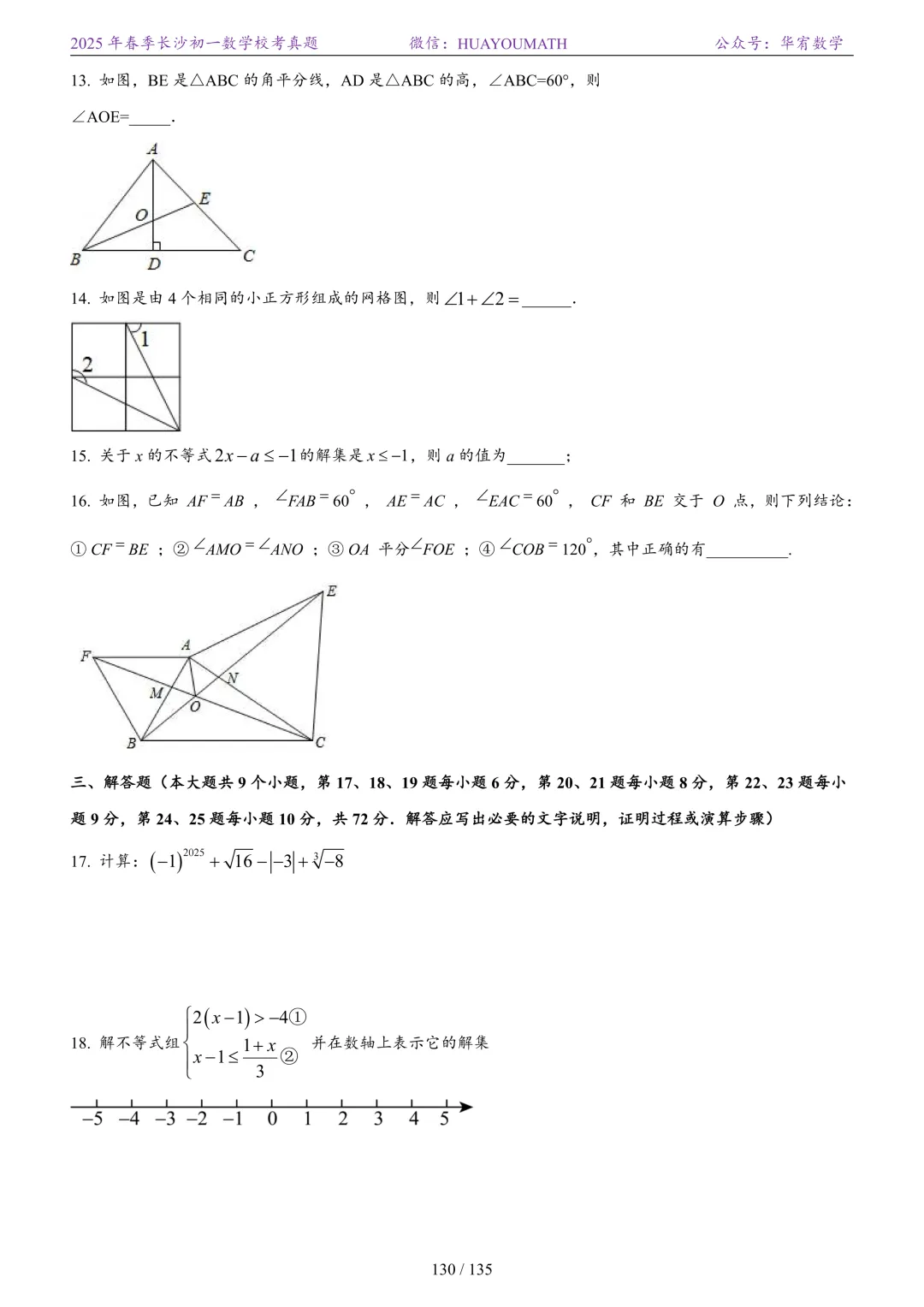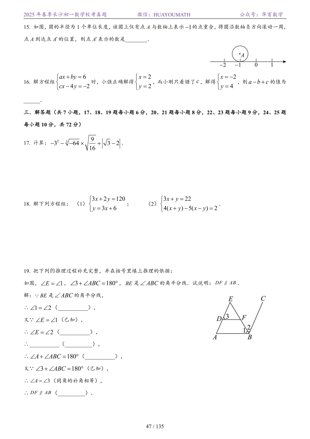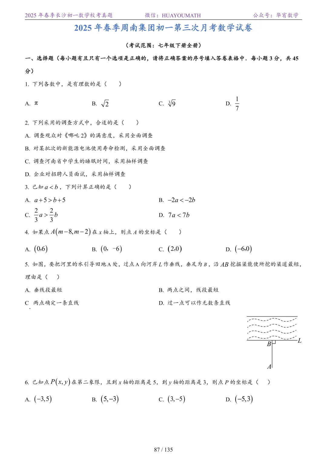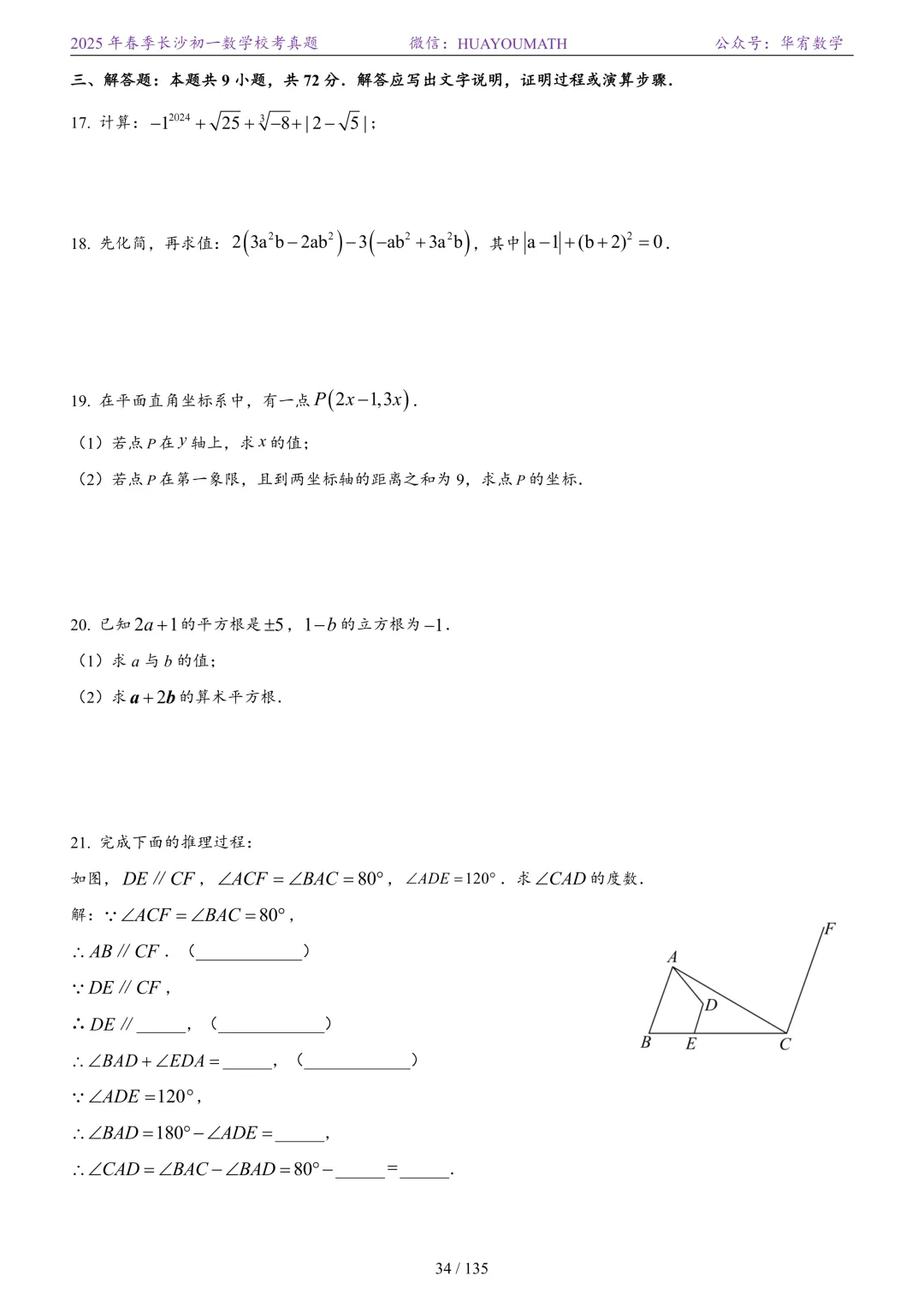 2025年春季长沙初一数学校考真题