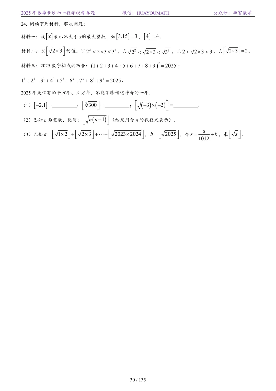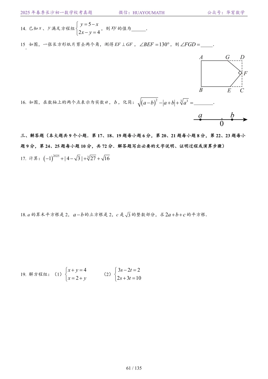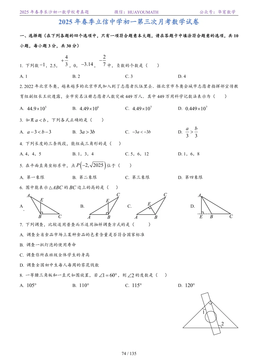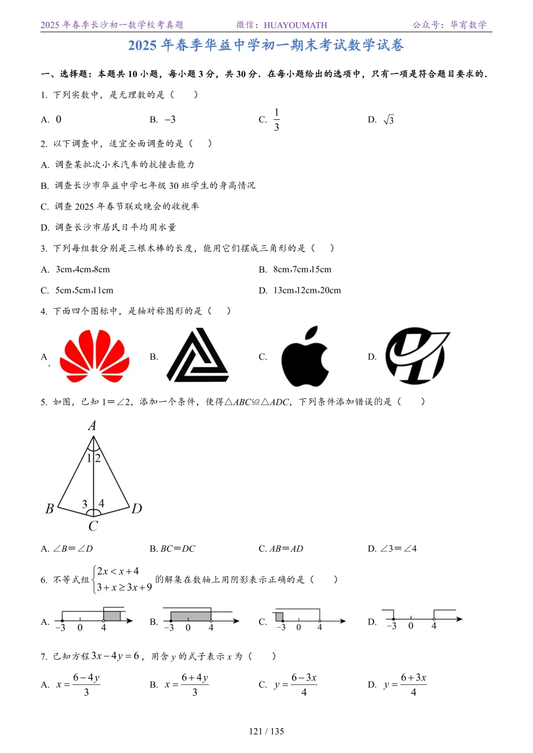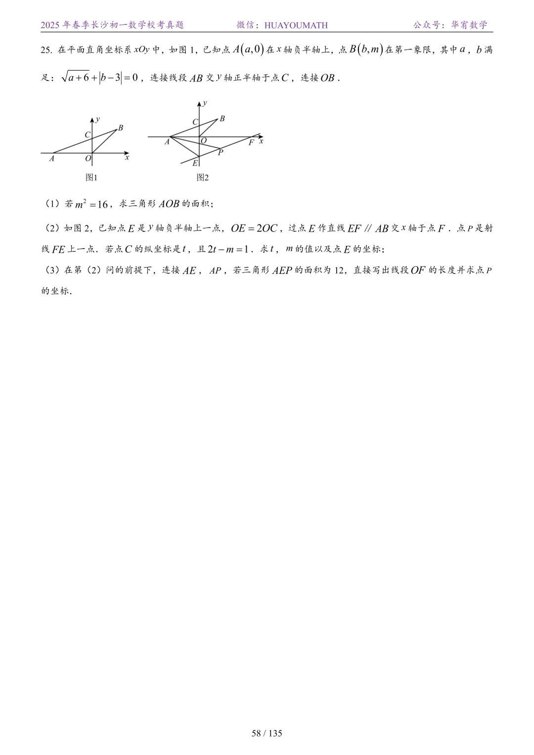 2025年春季长沙初一数学校考真题