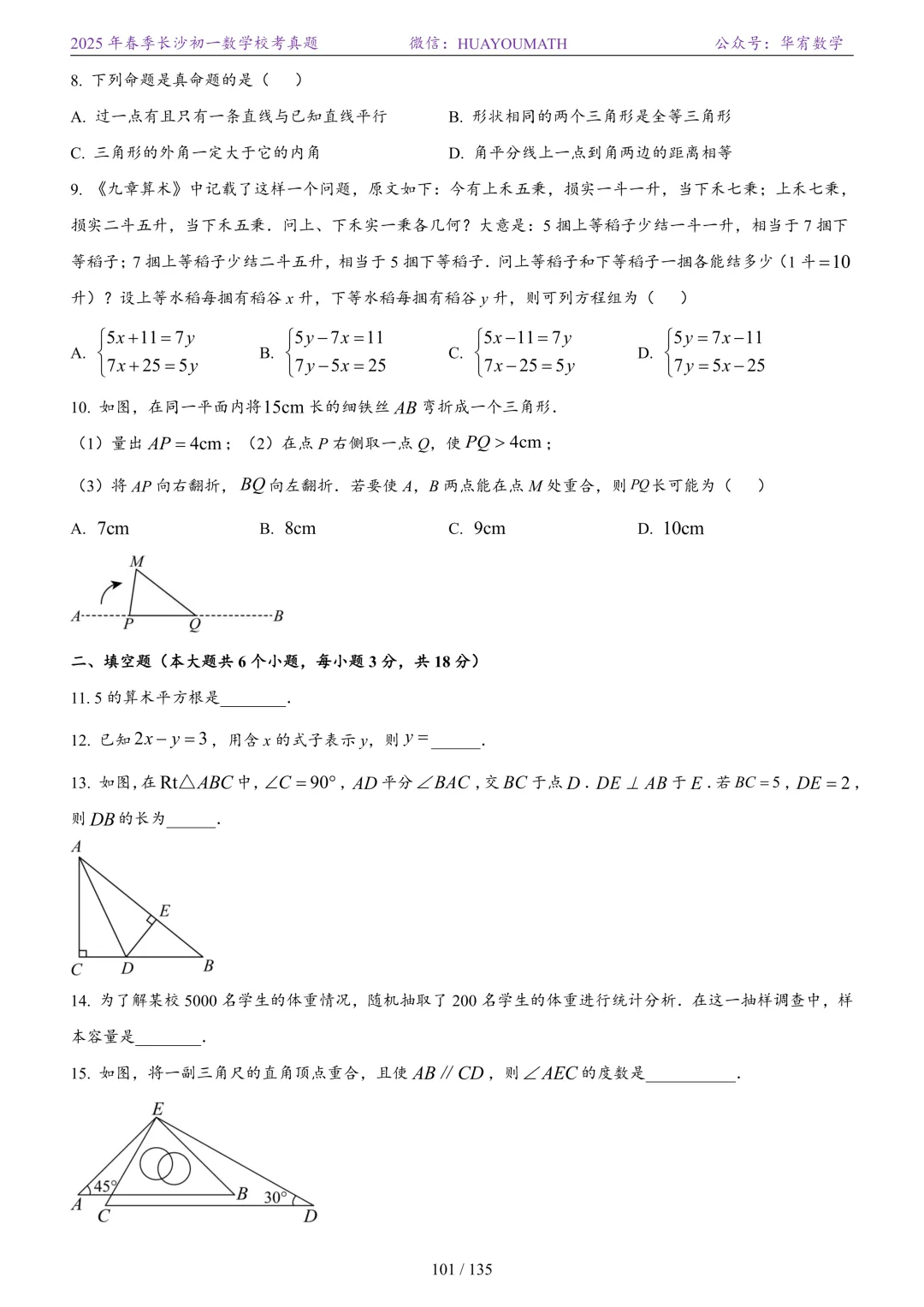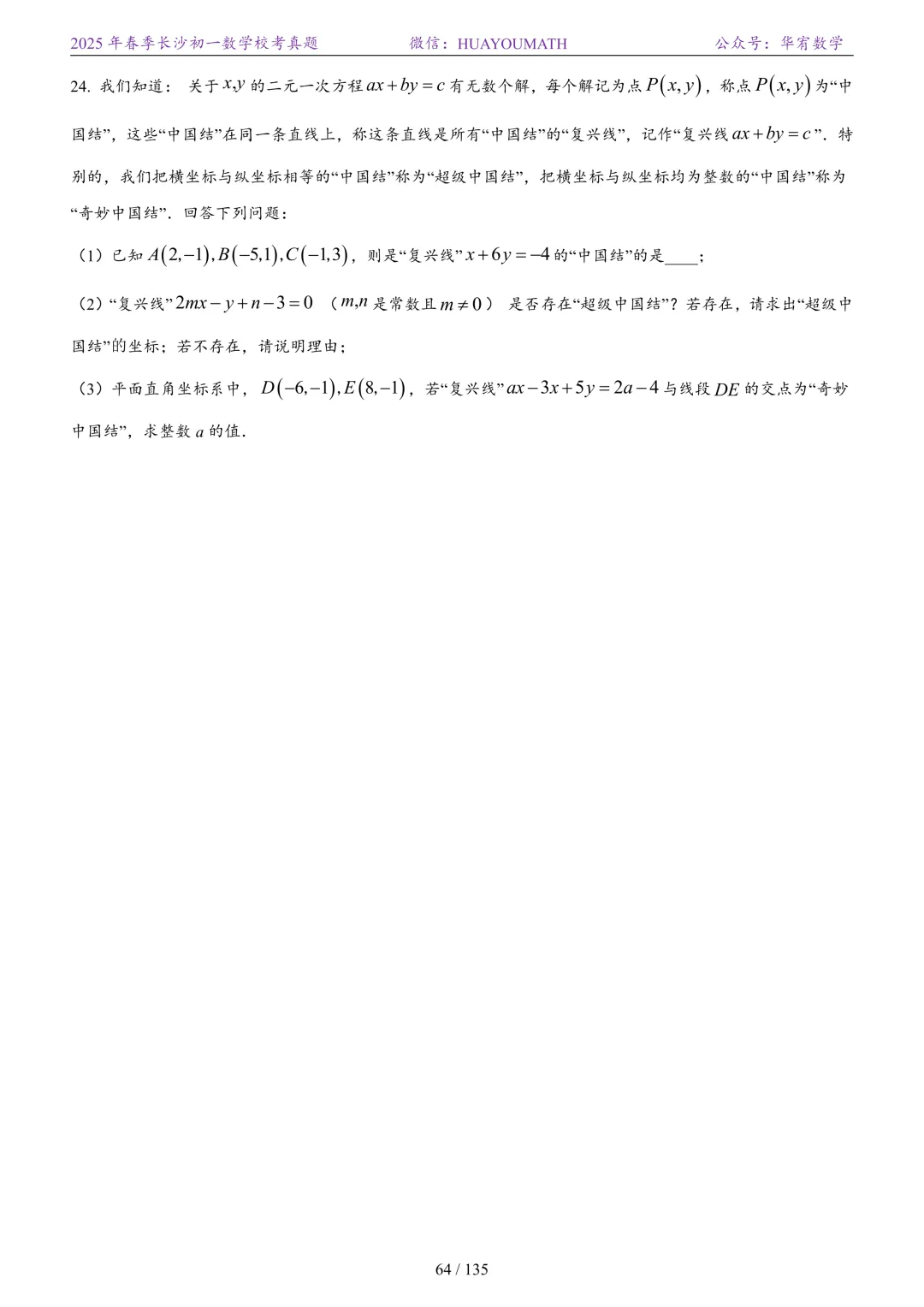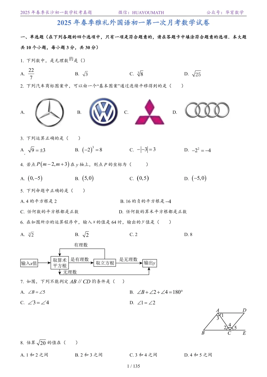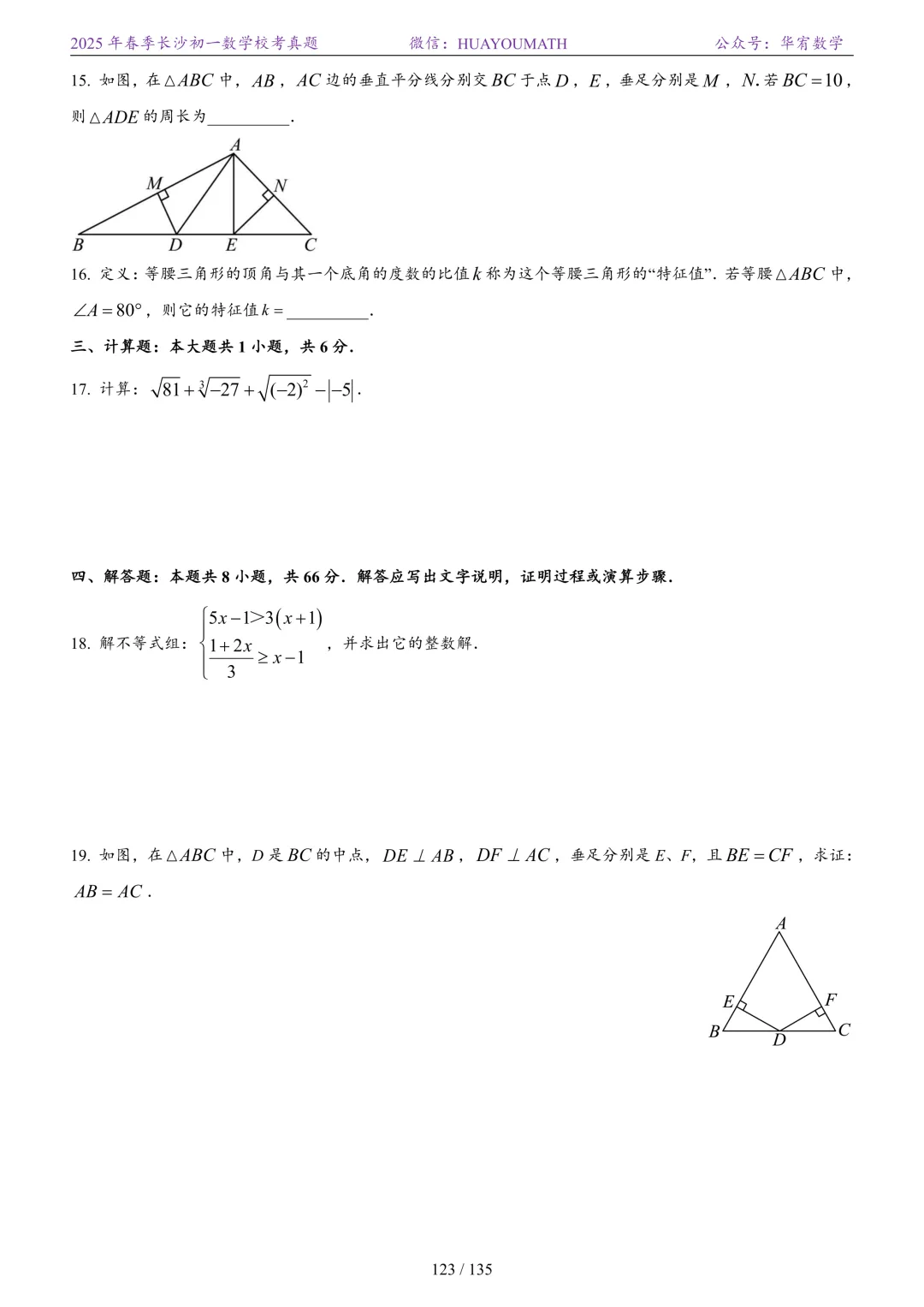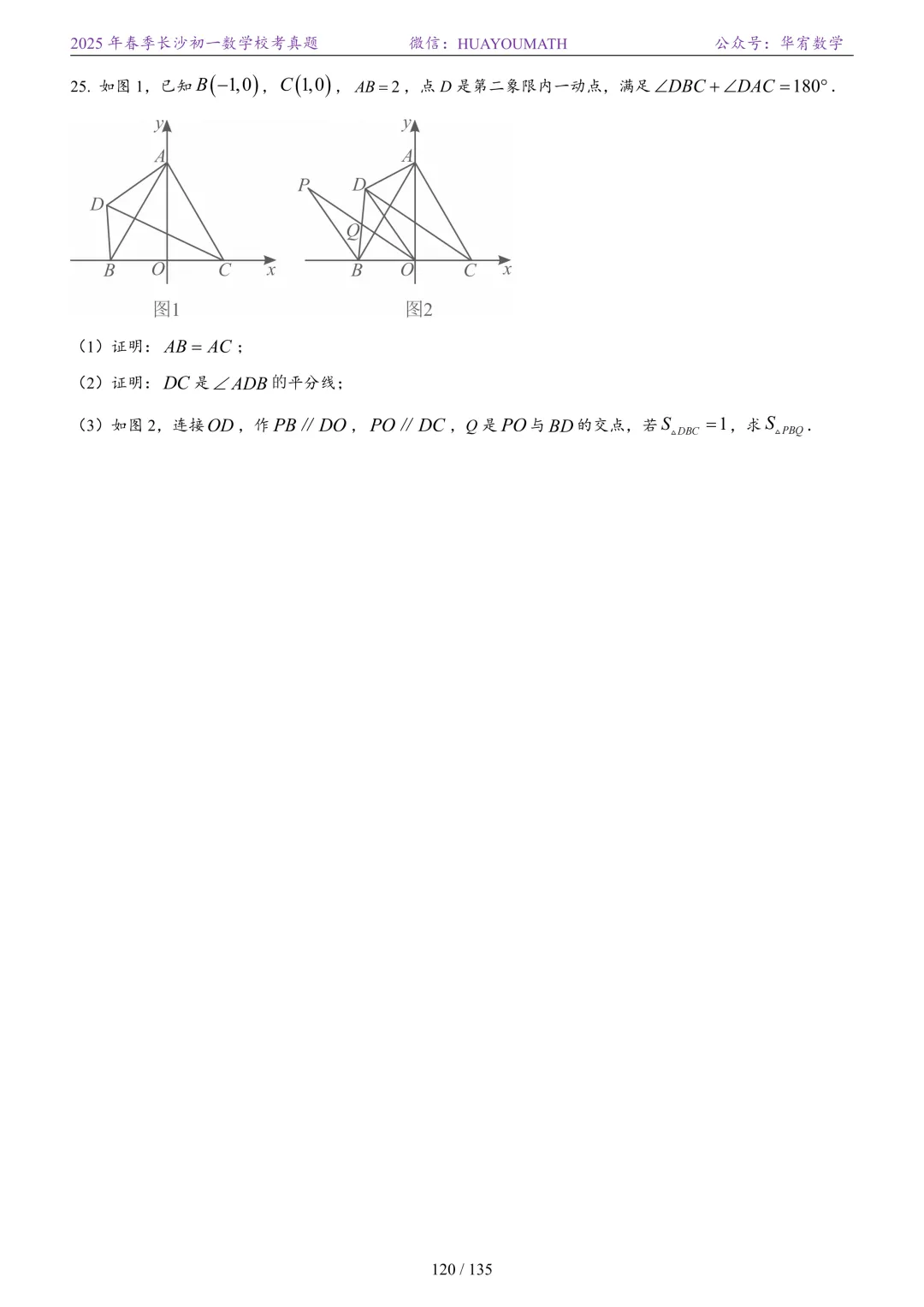2025年春季长沙初二数学校考真题