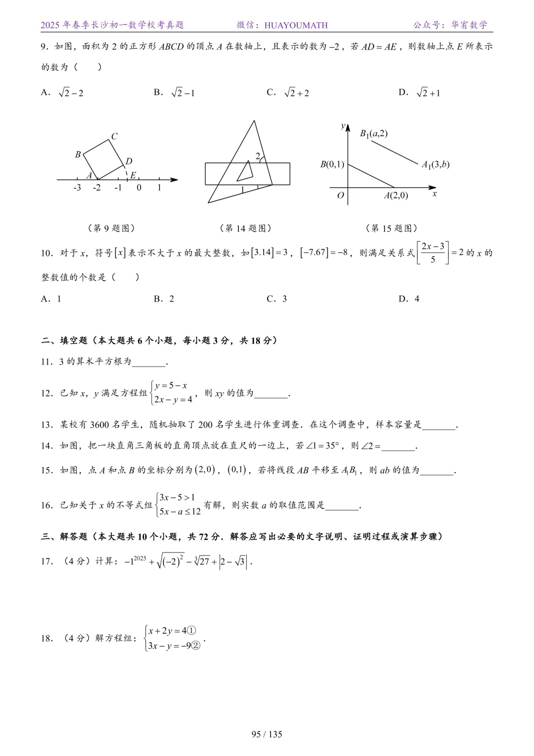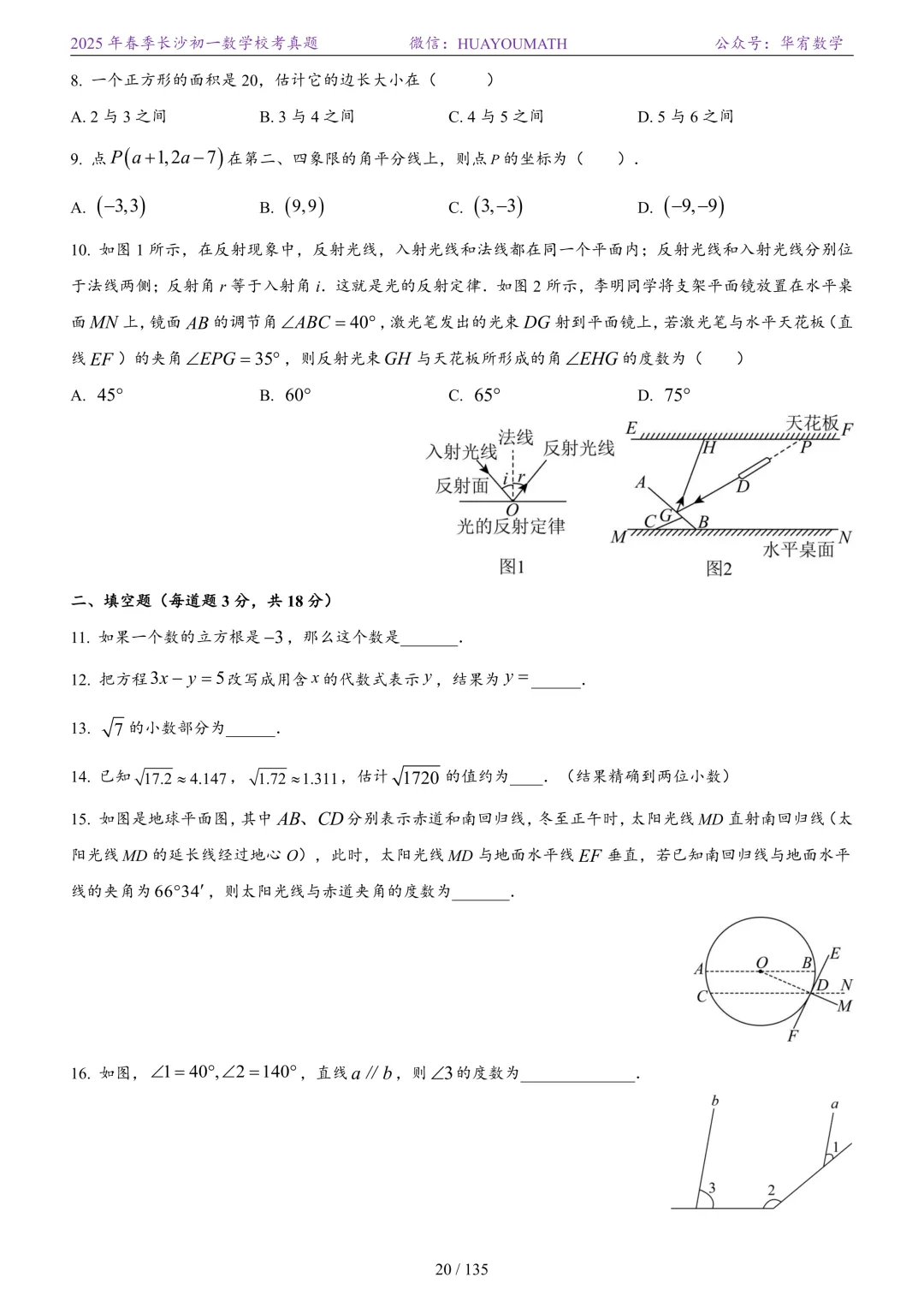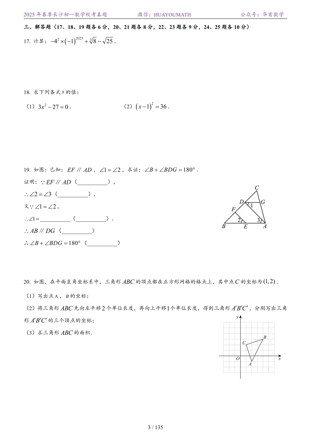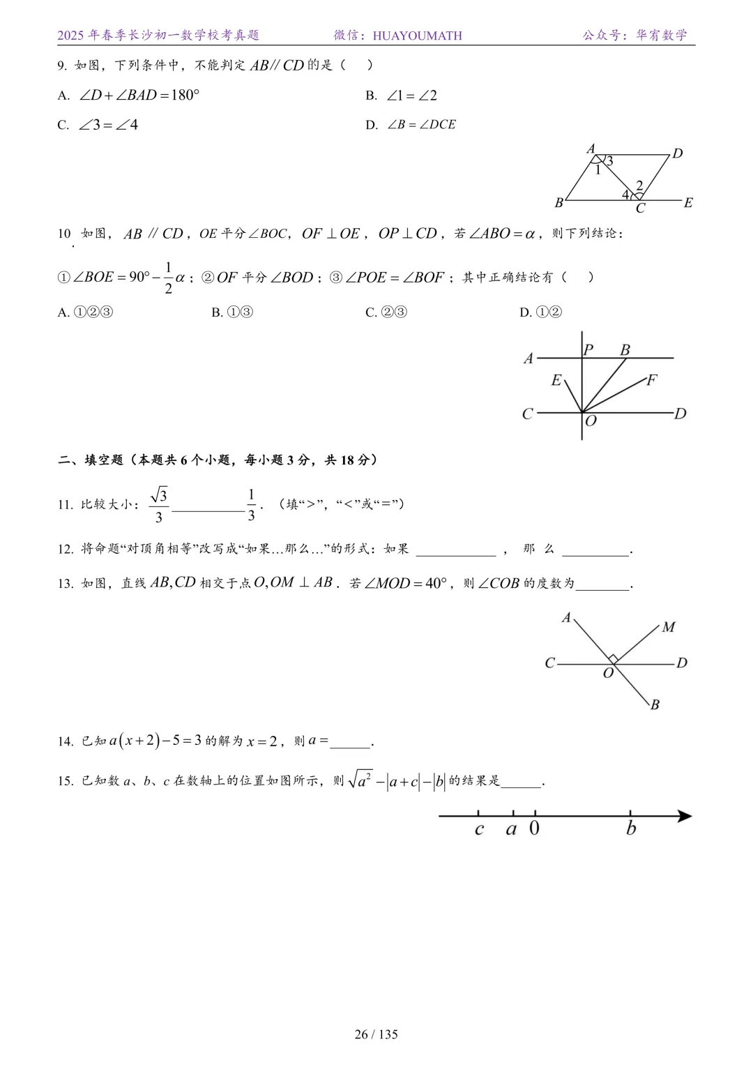 2025年春季长沙初三数学校考真题