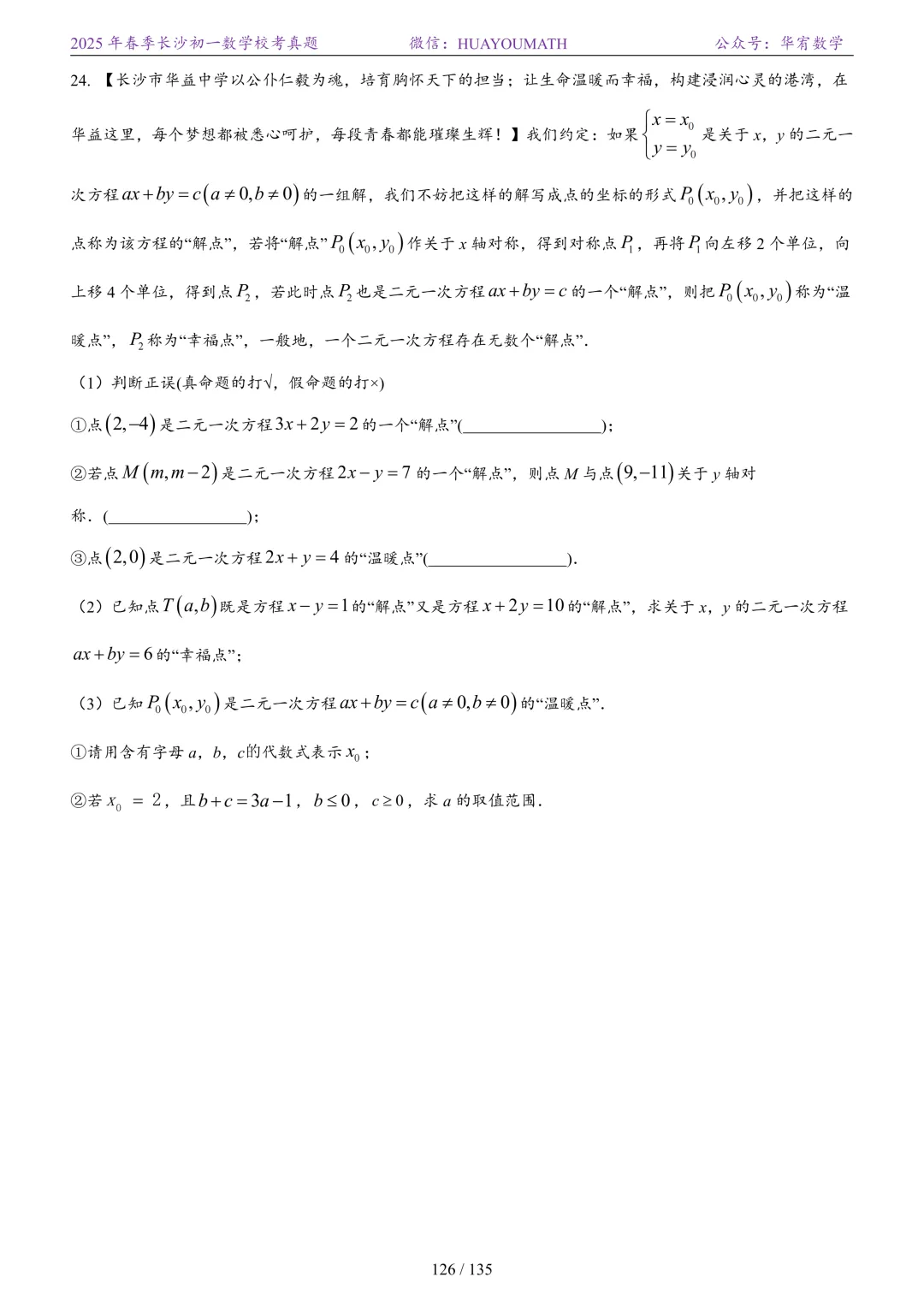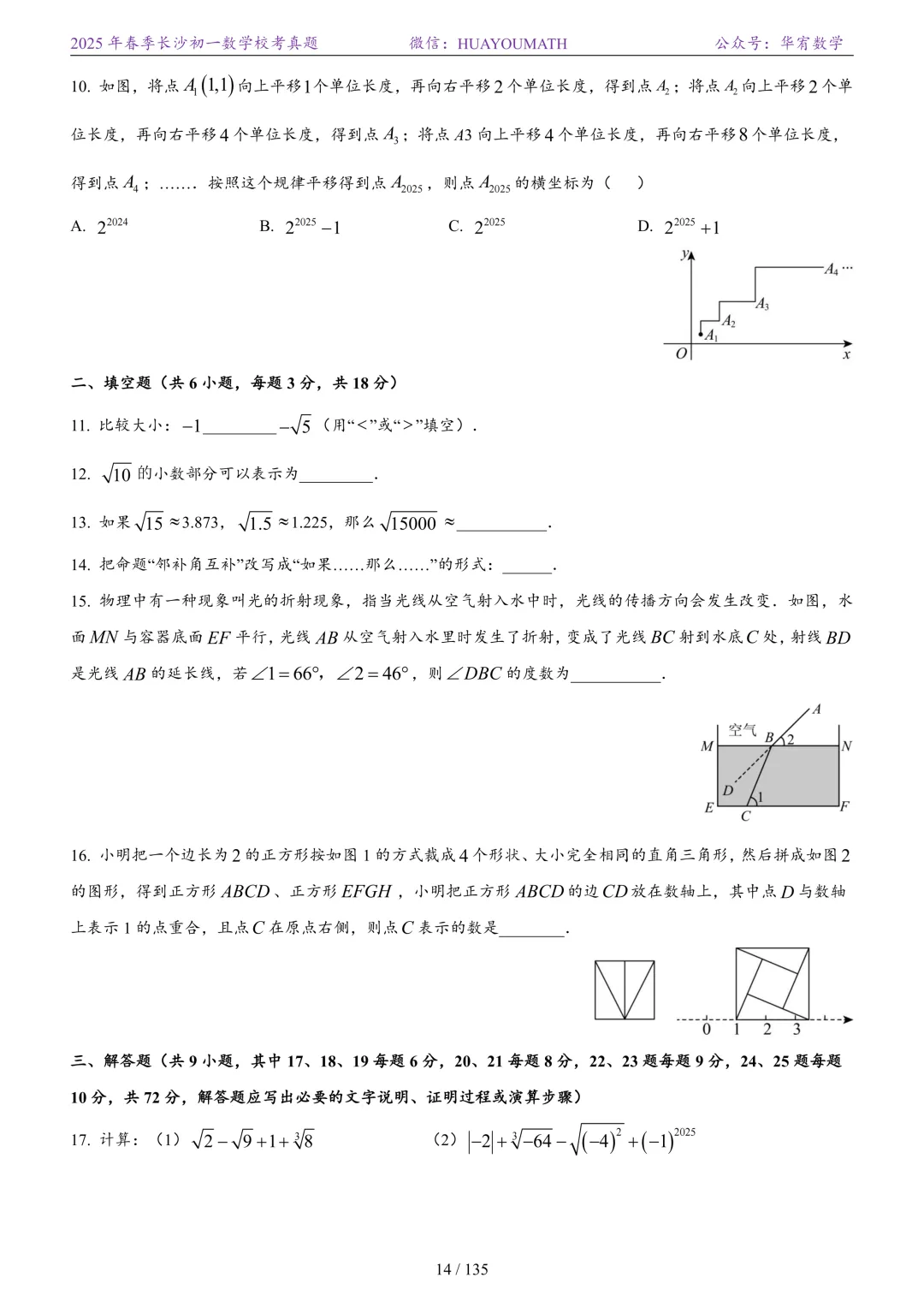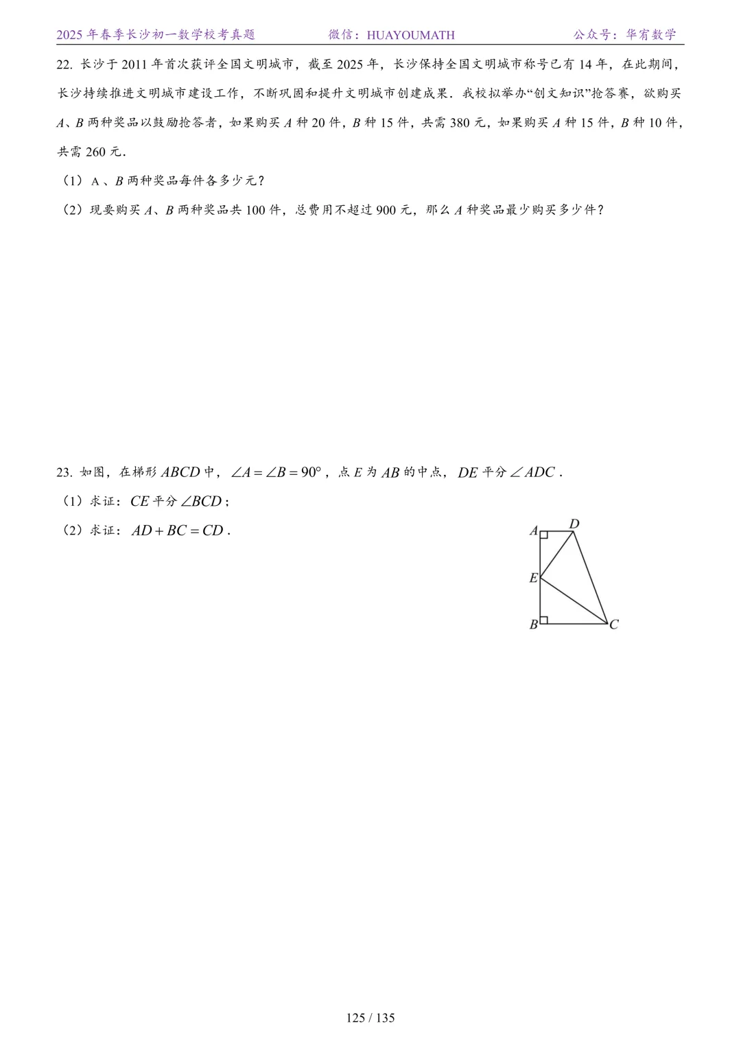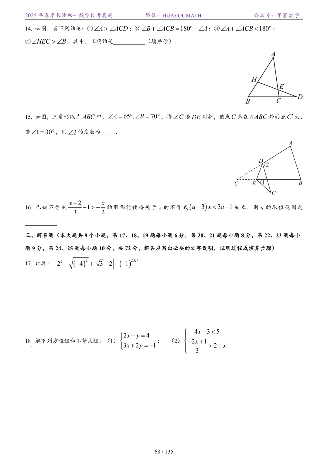 2025年春季长沙初三数学校考真题