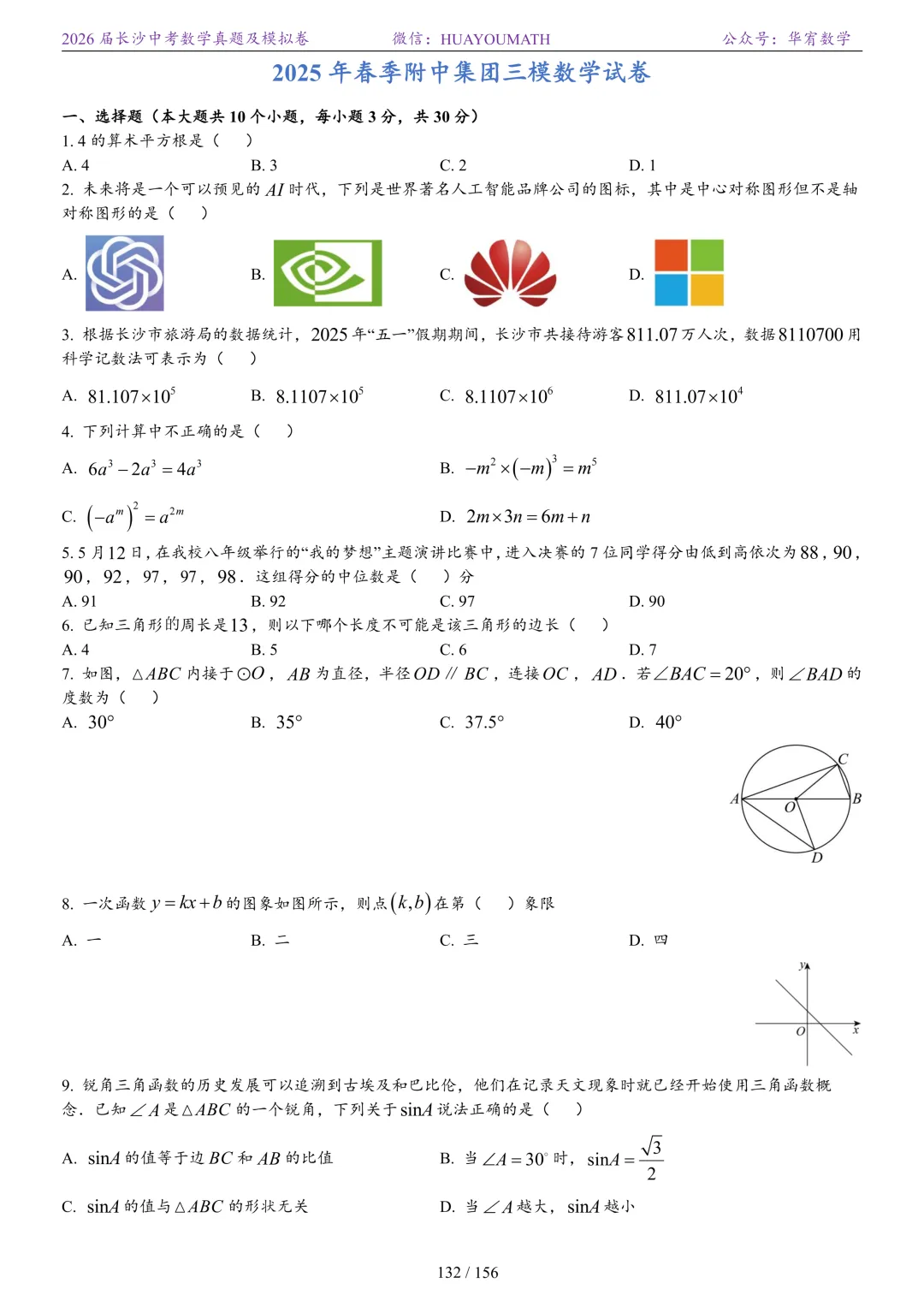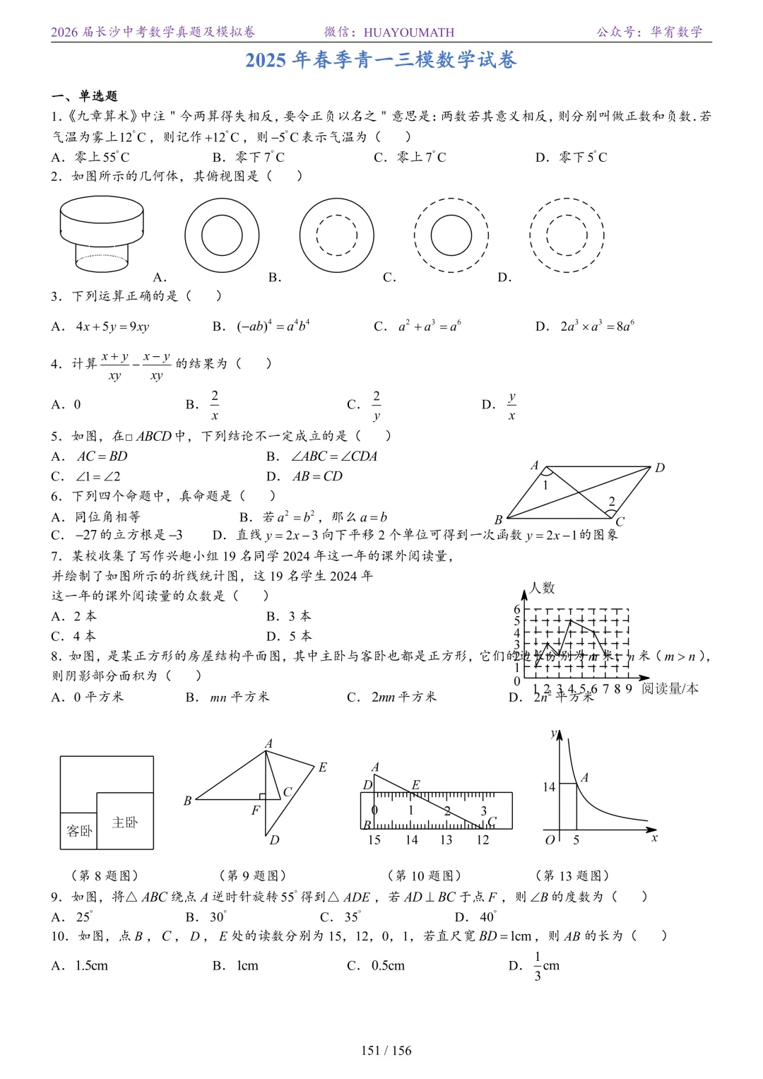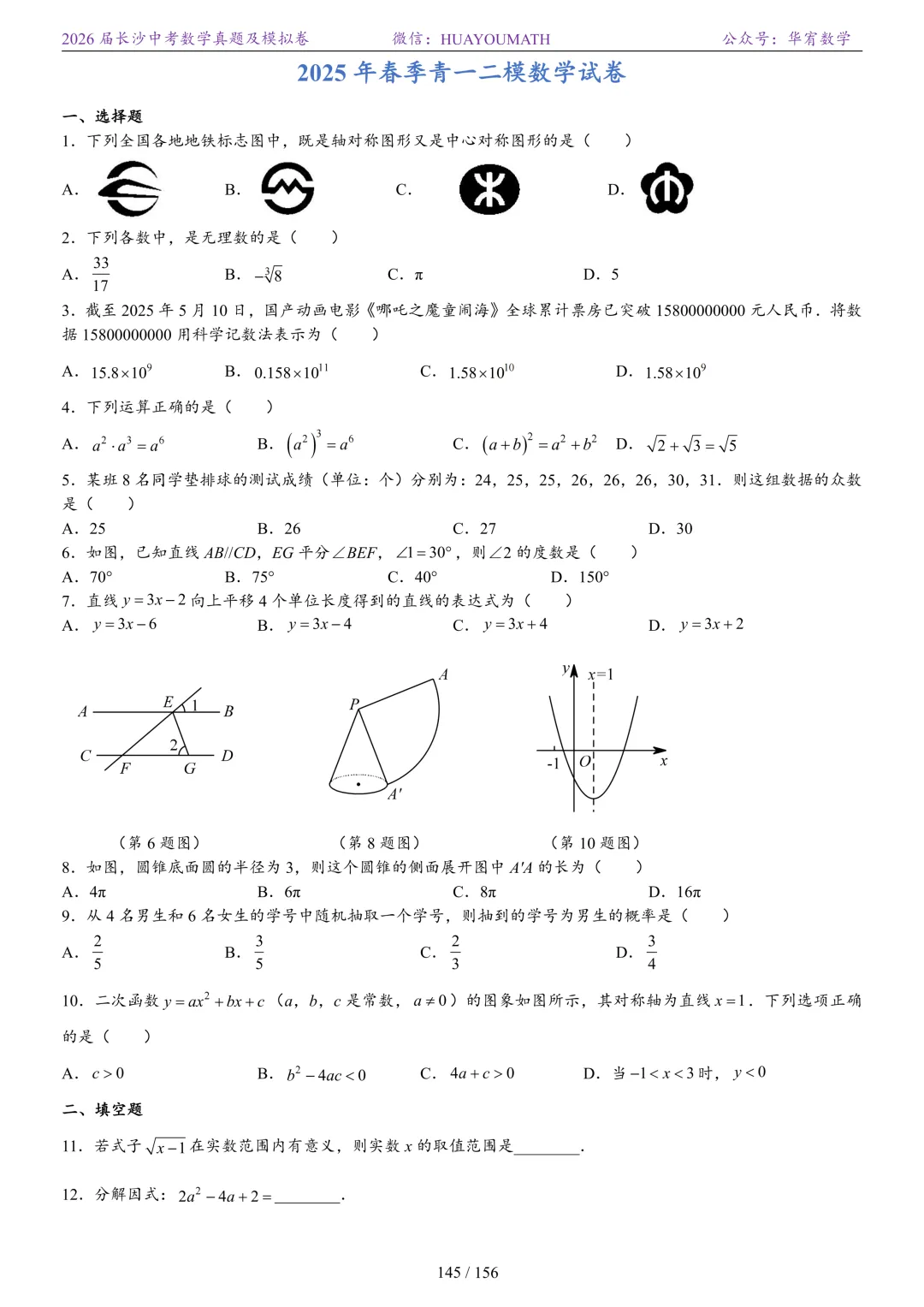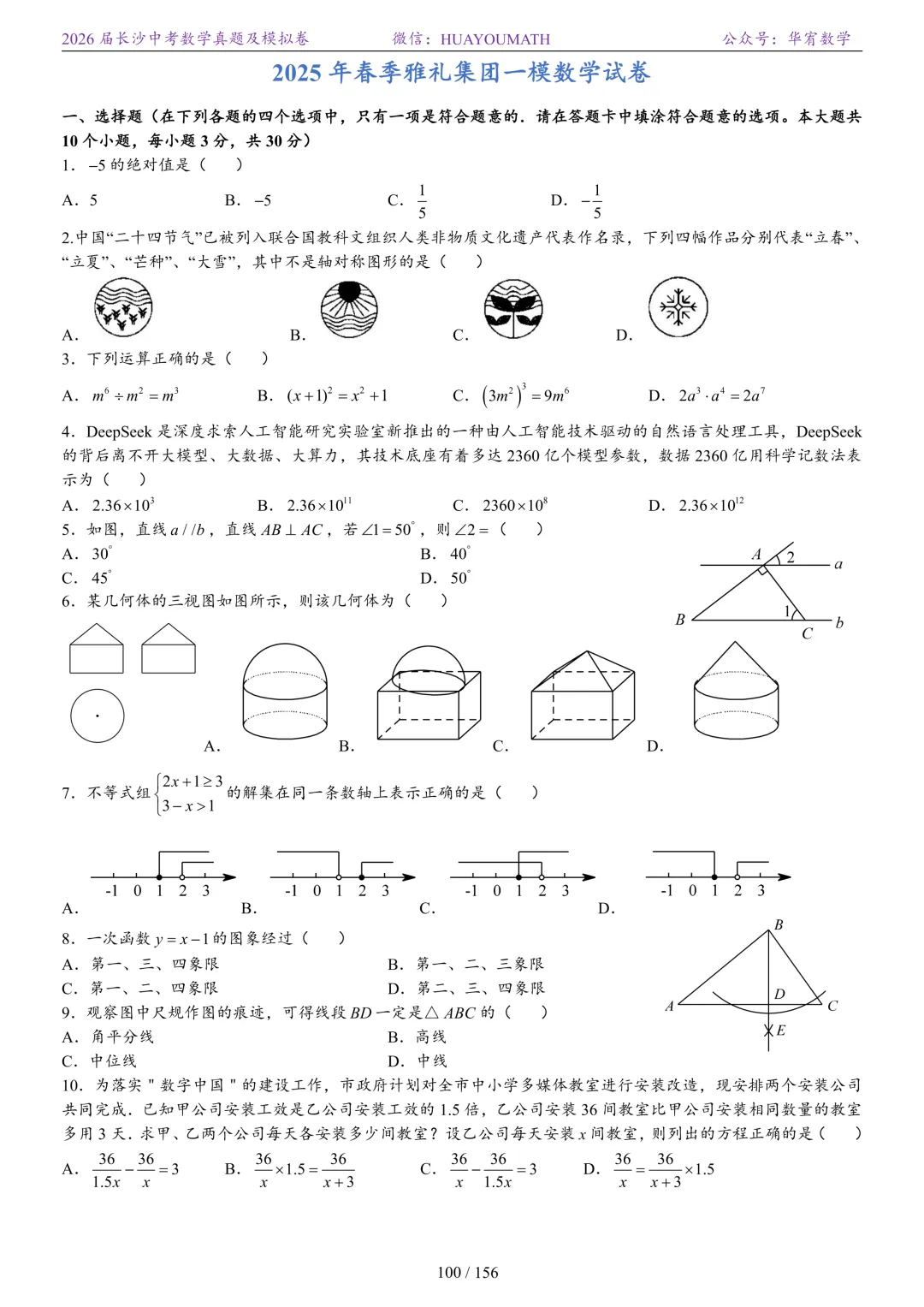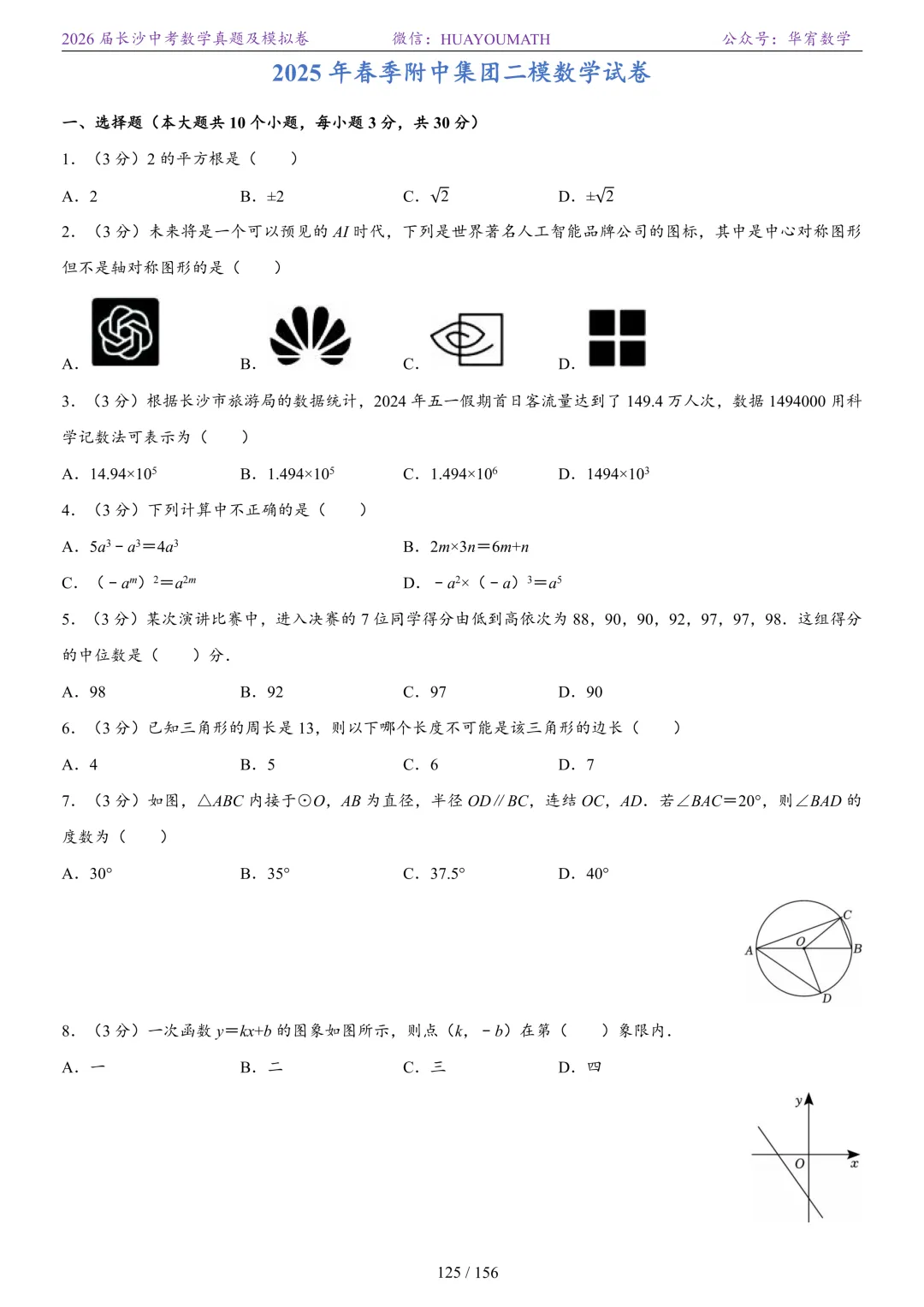 2025年春季长沙初三数学校考真题