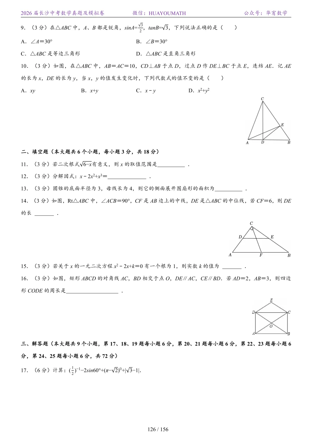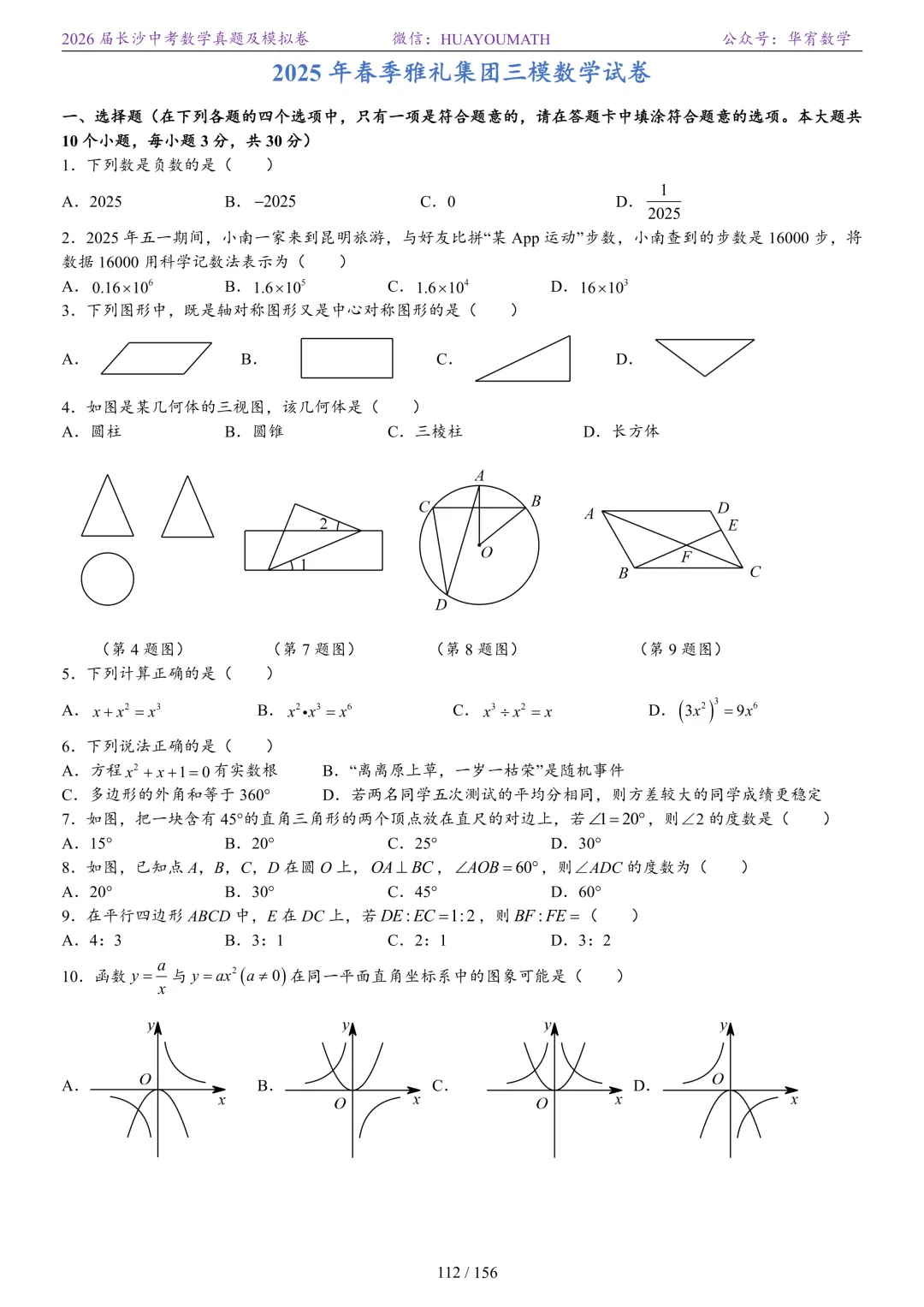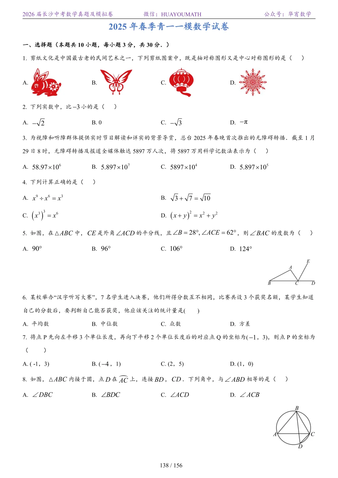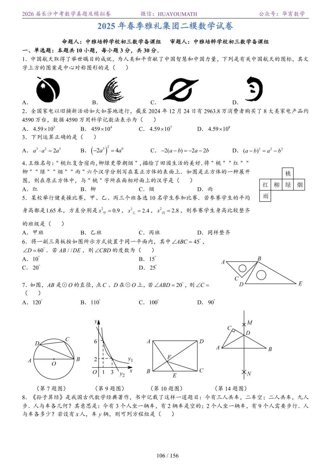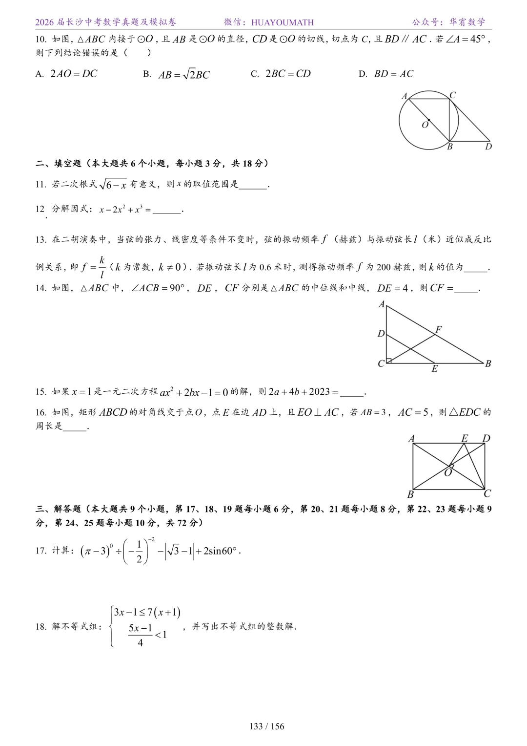 2025年春季长沙初三数学校考真题