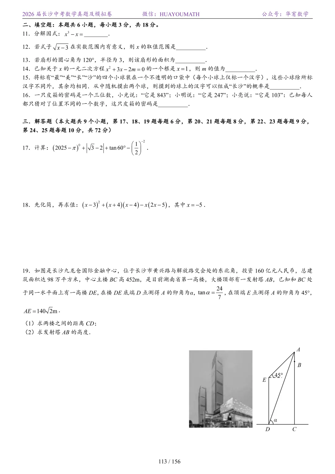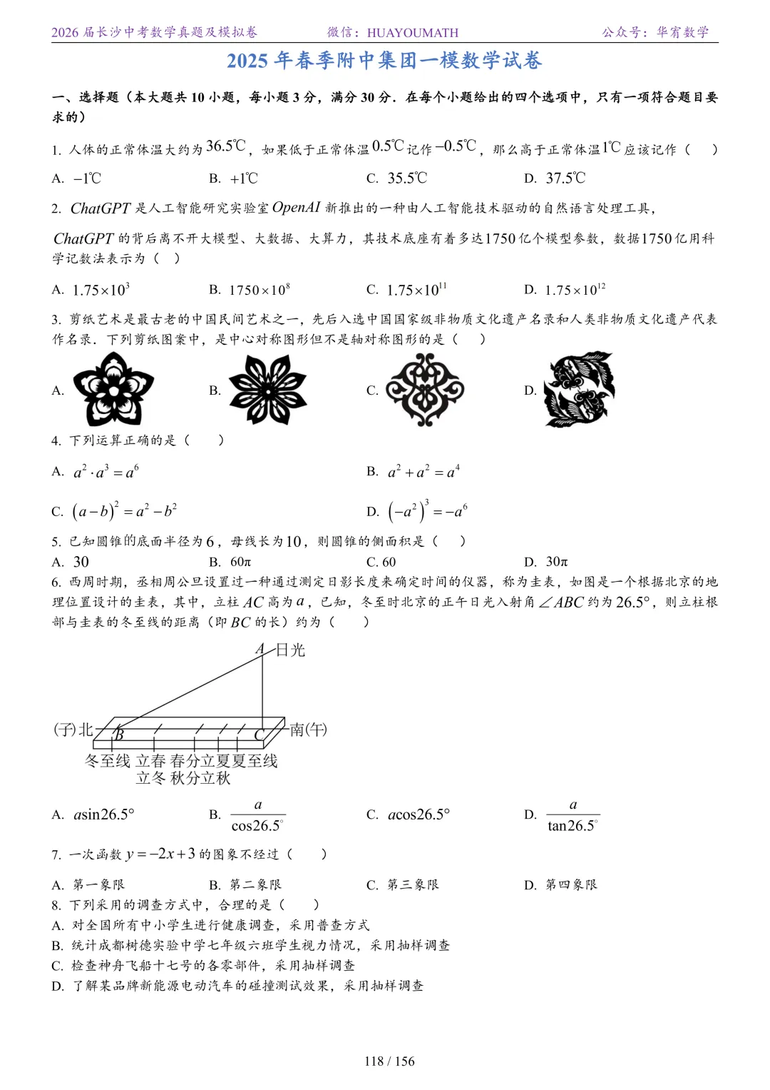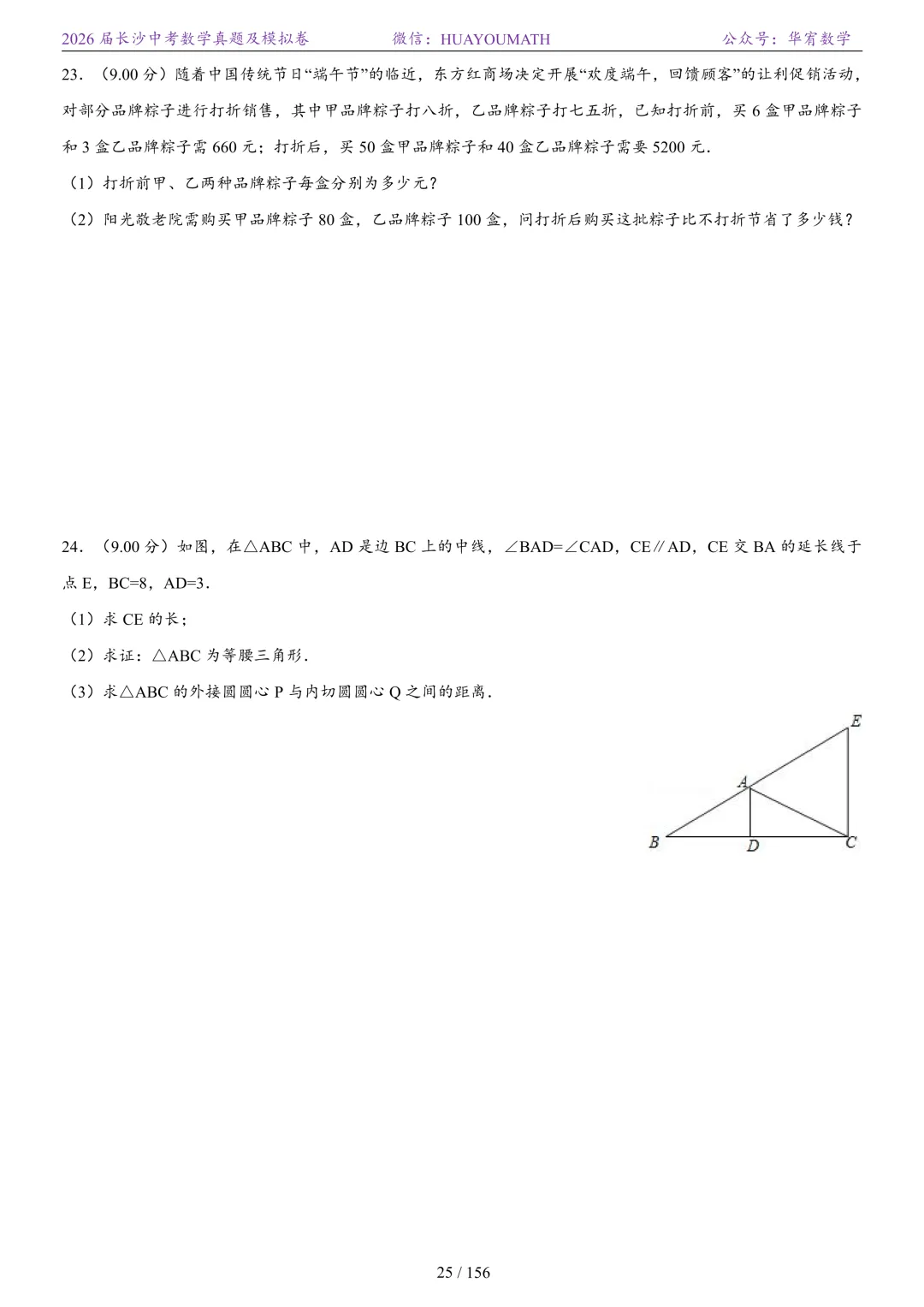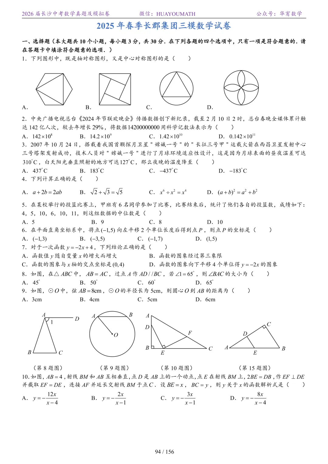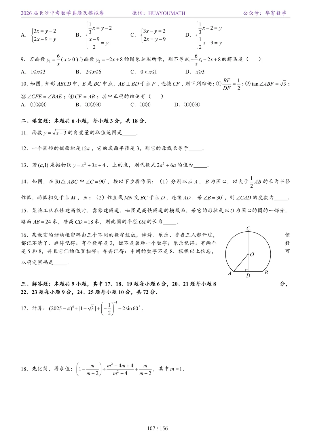 2025年春季长沙初三数学校考真题
