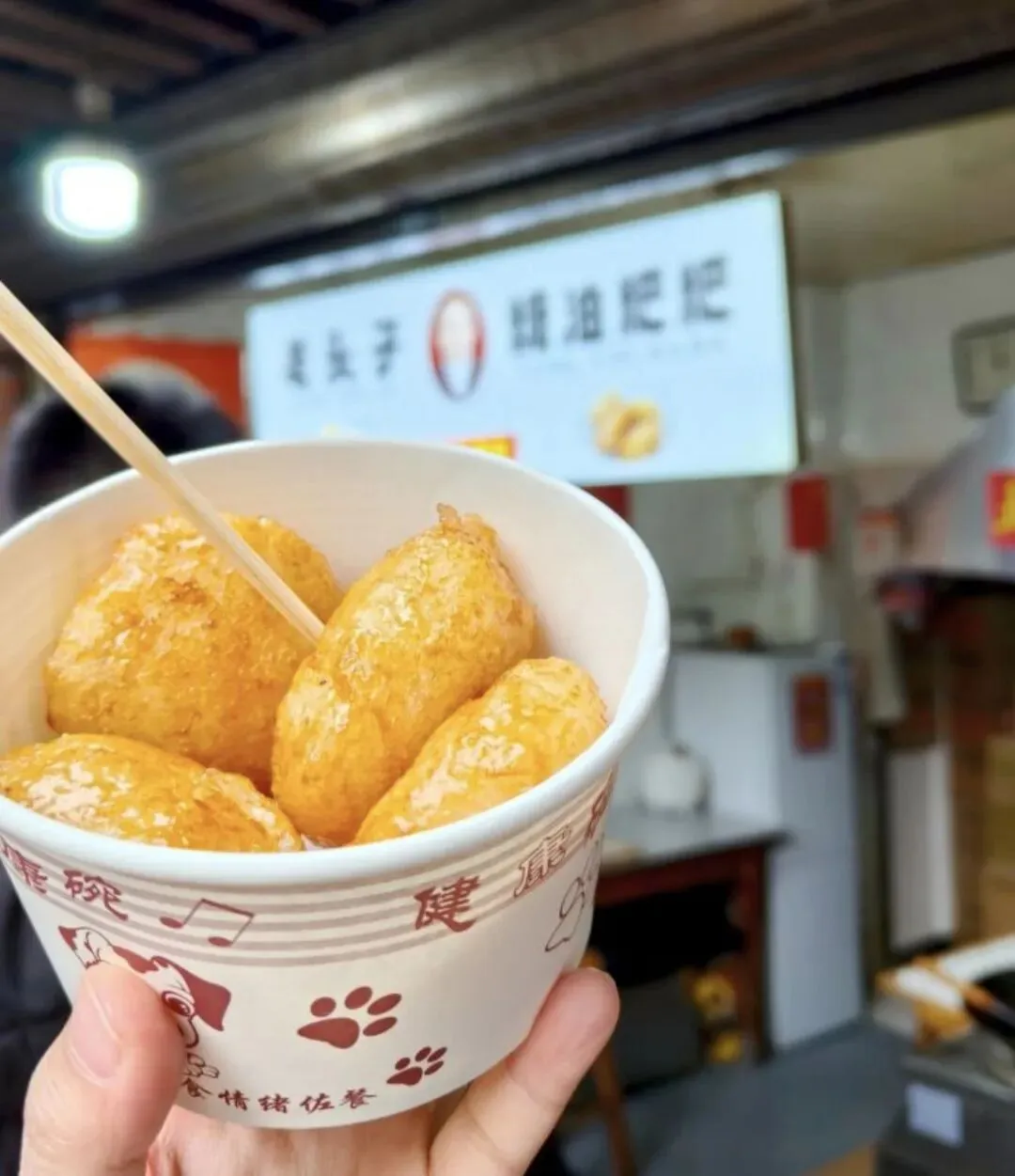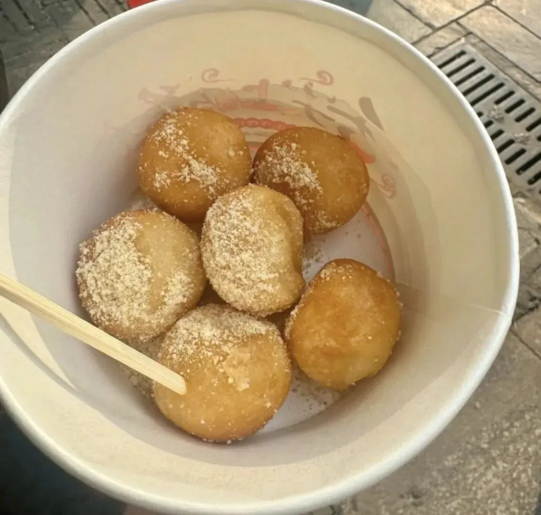 第一家老头子糖油粑粑,我们点了白糖油粑粑 粑粑吃起来和坨坨不太一样,除开形状,粑粑外面炸得很酥脆,里面的糯米内陷会少一点,吃起来更像是空心酥壳。