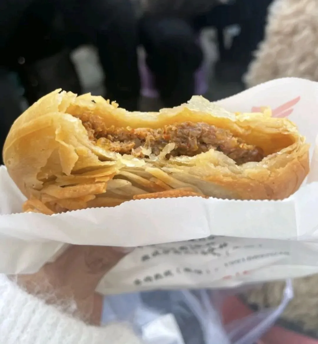 往前走就看到了天马牛肉饼。6块一个,性价比在线。外皮炸得超酥脆,一口掉渣,汁水很足,馅是牛肉+白菜丝,牛肉筋稍微多一点,口感一般。可以选不辣,辣的也不冲人,配他家糖水很解腻。